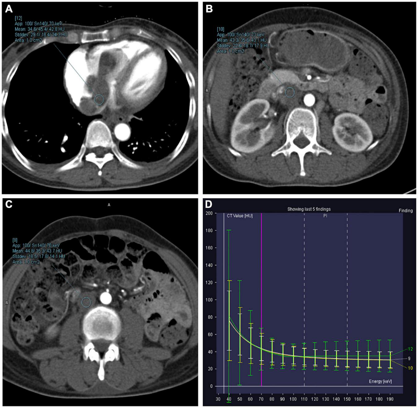 Right atrium, inferior vena cava (IVC) at the renal venous level, and IVC at the inferior mesenteric artery level-derived energy spectrum curve. The curves of each color represent the energy spectrum curves of each ROI. (A) Green: right atrial lesions. (B) Yellow: lesions of the IVC at the renal venous level. (C) White: lesions of the IVC at the inferior mesenteric artery level). (D) The energy spectrum curves represent the CT values of the ROI under different keV conditions.