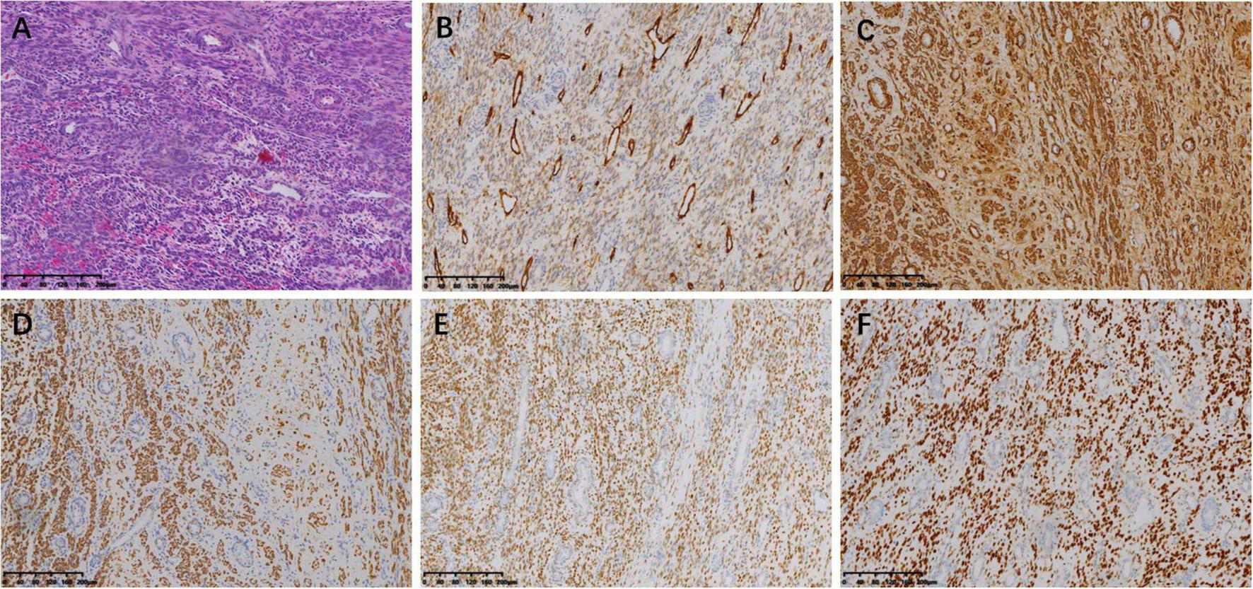 Microscopic examination of intracardiac and intravenous mass. (magnification, ×100). (A) Hematoxylin-eosin (HE) staining of the tumor cells. Immunohistochemical staining for CD10 (B), SMA (C), Desmin (D), ER (E), and PR (F).