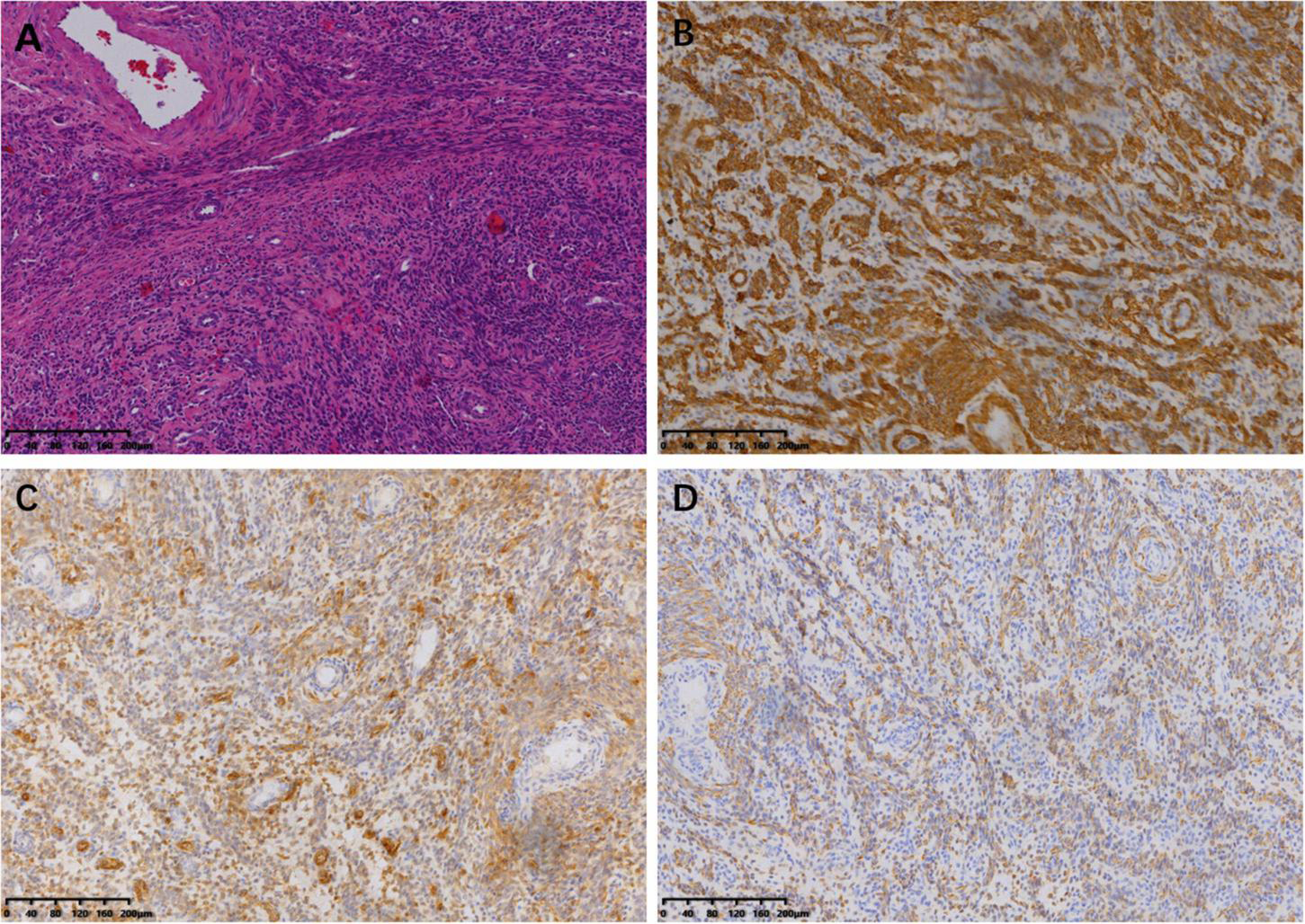 Microscopic examination of uterine lesion (magnification, ×100). (A) HE staining of the tumor cells. Immunohistochemical staining for SMA (B), CD10 (C), and Desmin (D).