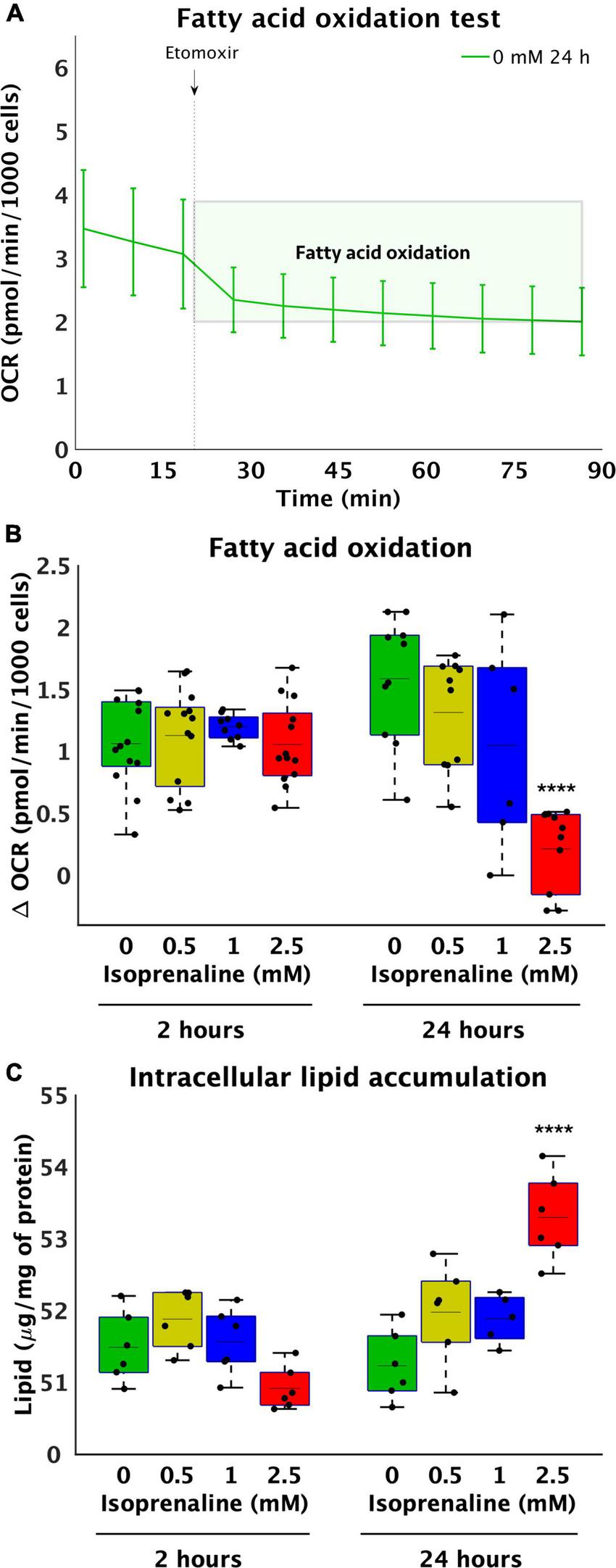 Reduce utilization of medium-length fatty acids and increase lipid accumulation after high-level and long-term exposure to isoprenaline. (A) Representative graph of the oxygen consumption rate (OCR) of HL-1 cardiomyocytes before and after 40 μM etomoxir inhibition. (B) Quantification of fatty acid oxidation calculated from (A). Statistical significance was assessed using two-way ANOVA (effect of concentrations: p = 4.53 × 10–7, time: p = 0.5643, interaction: p = 1.76 × 10–6) followed by Sidakholm multiple comparisons. (A,B)n = 12 biological replicates per group, one technical replicate, (C) Intracellular lipid accumulation in HL-1 cardiomyocytes expose to 0 mM, 0.5 mM, 1.0 mM, and 2.5 mM levels of isoprenaline for 2 h and 24 h (effect of concentrations: p = 7.03 × 10–5, time: p = 0.0043, interaction: p = 2.13 × 10–7). n = 6 replicates per group, 2 technical replicates.