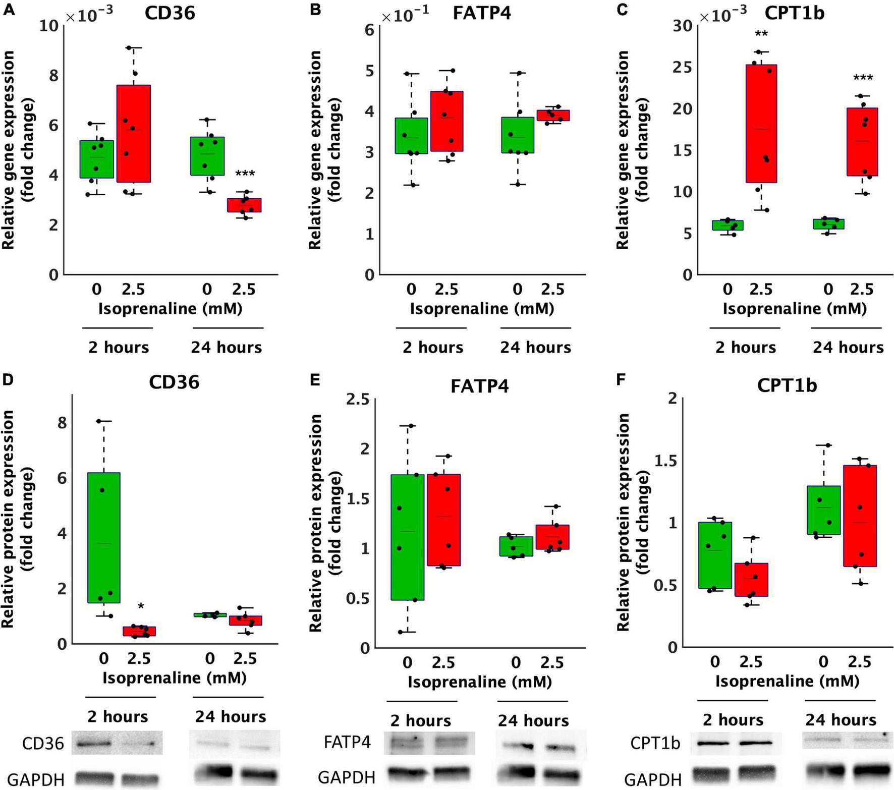 Altered gene and protein expression of lipid transporters in HL-1 cardiomyocytes exposed to isoprenaline. (A–C) qPCR analysis of HL-1 cardiomyocytes exposed to 0.0 mM and 2.5 mM levels of ISO for 2 h (green boxes) and 24 h (red boxes). Statistical significance was assessed using a two-tailed t-test. N = 6 replicates per group. All values shown for the PCR analyses are relative to the housekeeping gene TBP and GUSB. n = 6 replicates per group, 3 technical replicates, (D–F) Western blot analyses of HL-1 cardiomyocytes exposed to 0.0 mM and 2.5 mM levels of ISO for 2 h (green boxes) and 24 h (red boxes). Statistical significance was assessed using a two-tailed t-test. All values shown for the PCR analyses are relative to the loading control GAPDH. n = 6 replicates per group, 2 technical replicates.