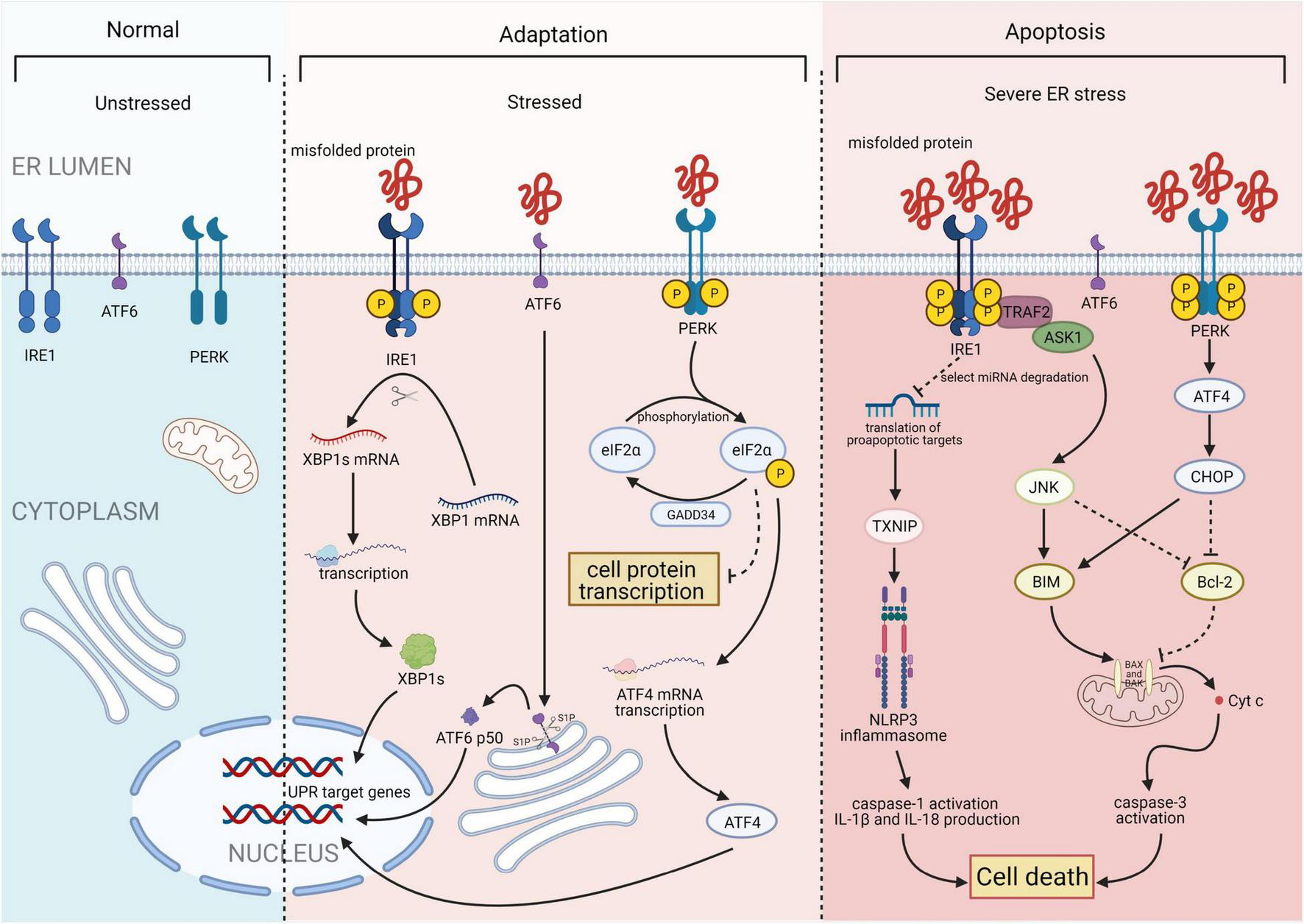 Three major states of endoplasmic reticulum stress (ERS): unstressed, stressed, and severe ERS. In the absence of stress, PKR-like ER kinase (PERK), activating transcription factor 6 (ATF6), and inositol-requiring enzyme 1 (IRE1) are maintained in an inactive state. Upon activation, the IRE1 endoribonuclease domain specifically recognizes and cleaves a 26-base fragment from the X-box binding protein 1 (XBP1) mRNA transcript, resulting in XBP1s. PERK phosphorylates the alpha subunit of eukaryotic translation initiation factor 2 (eIF2α), that leads to a downregulation of overall mRNA translation, which reduces the accumulation of unfolded proteins. Phosphorylation of eIF2α also induces the translation of ATF4. ATF6 will be cleaved by two Golgi resident proteases to release its N-terminal transcriptionally active 50-kDa fragment. Thereafter, the 50-kDa N-terminus protein will translocate into the nucleus to activate transcription. Finally, after activation of ATF6, IRE1, and PERK, the unfolded protein response (UPR) is constitutively activated. Under severe ERS, IRE1 forms a complex with tumor necrosis factor receptor-associated factor 2 (TRAF2) and apoptosis signal-regulating kinase 1 (ASK1) to activate c-Jun N-terminal kinase (JNK) and the caspase family. This process activates the NACHT, LRR, and PYD domain-containing protein 3 (NLRP3) inflammasome. ATF4 and C/EBP homologous protein (CHOP) synergistically induce the expression of multiple genes involved in apoptosis, autophagy, and antioxidant responses, which all lead to cell death. Figures were created using BioRender.com.