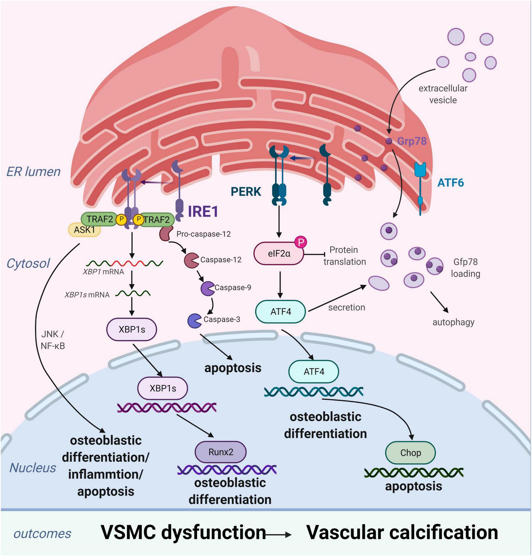 Endoplasmic reticulum stress (ERS) promotes vascular calcification (VC) by inducing the osteogenic differentiation, autophagy, and apoptosis of vascular smooth muscle cells (VSMCs). In response to ERS, VSMCs differentiate into calcifying VSMCs via multiple mechanisms, including osteogenic differentiation, apoptosis, and autophagy. Inositol-requiring enzyme 1 (IRE1) can promote osteoblastic differentiation via nuclear factor kappa B (NF-κB), the IRE1α-XBP1 axis, and RUNX2 signaling pathways and aggravate apoptosis by the IRE1α-ASK-JNK and caspase-12 pathways. PKR-like ER kinase (PERK) induces apoptosis via the PERK-eIF2α-CHOP signaling pathway and osteogenic differentiation via ATF4 activation. Extracellular vesicles, induced by increased expression of Grp78 and ATF4, attract inflammatory cells and induce VC. Figures were created using BioRender.com.