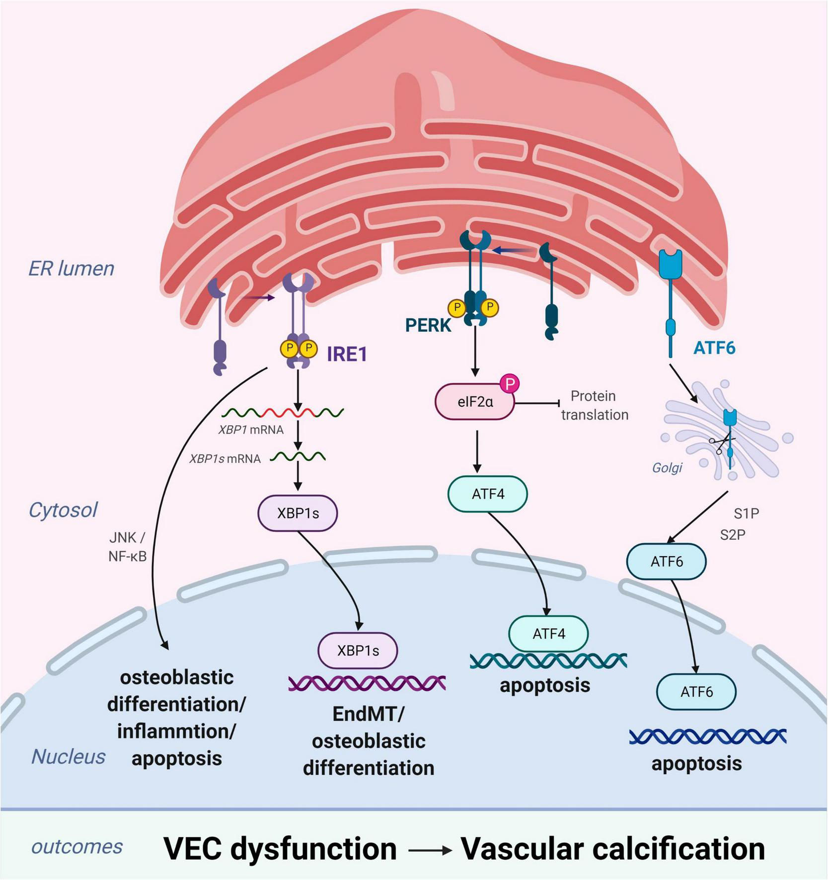 Endoplasmic reticulum stress (ERS) promotes vascular calcification (VC) by inducing the osteogenic differentiation and apoptosis of vascular endothelial cells (VECs). In response to ERS, inositol-requiring enzyme 1 (IRE1) can aggravate EndMT through the IRE1α-XBP1 axis, promote osteoblastic differentiation via the nuclear factor kappa B (NF-κB) signaling pathway and the IRE1α-XBP1 axis, and induce apoptosis via the IRE1α-ASK-JNK pathway. PKR-like ER kinase (PERK) promotes apoptosis via the PERK-eIF2α-ATF4 signaling pathway. High expression of active ATF6 may exacerbate VEC apoptosis through the mitochondrial apoptotic pathway. Figures were created using BioRender.com.
