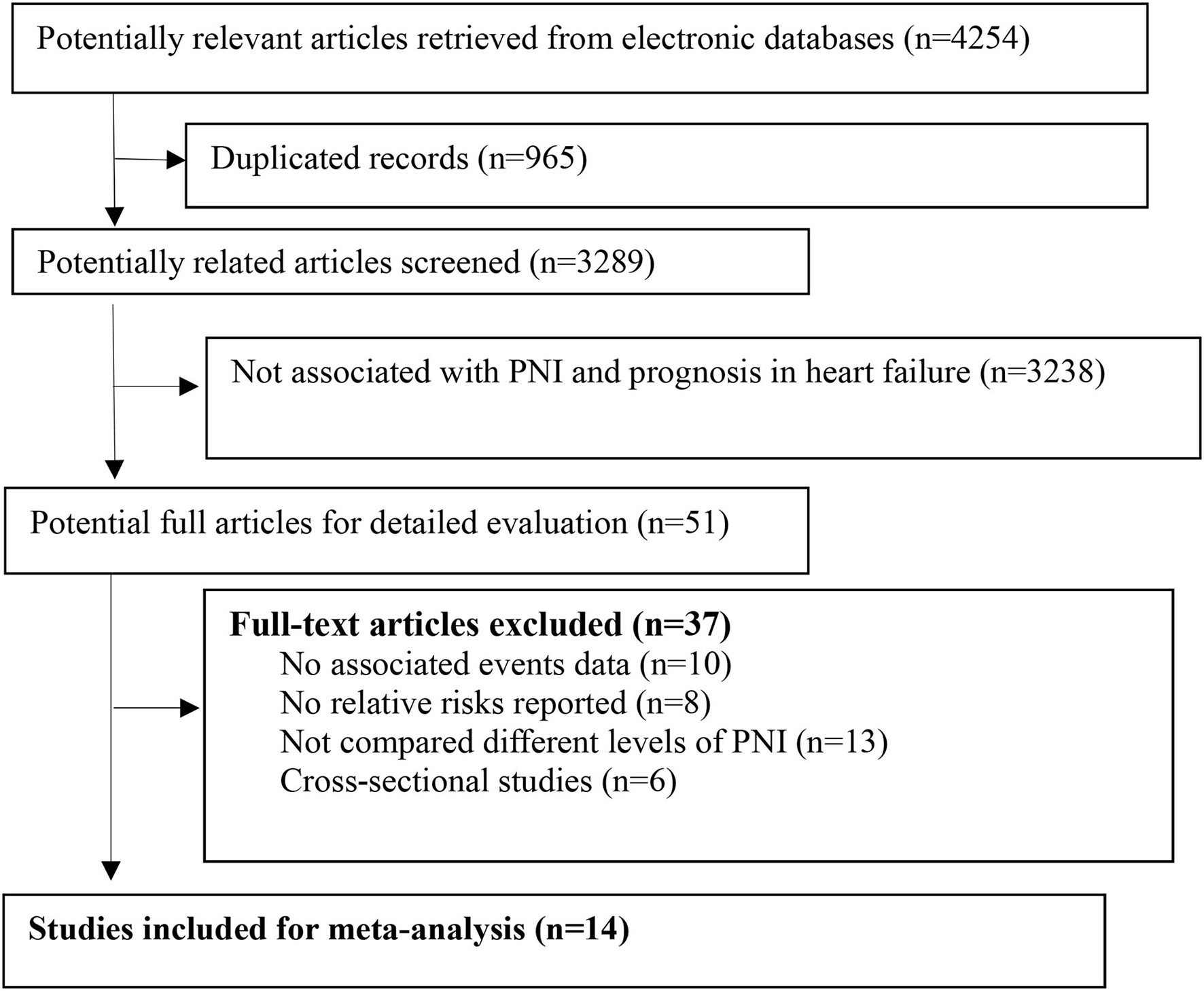 Some limitations should be noted in the current study. First, the type and definition of HF were different in the included studies, which may contribute to the clinical heterogeneity. Second, the underlying inflammation status was not adjusted in most of the included studies. Therefore, it is difficult to attribute the prognostic effect of PNI to only malnutritional status or a combination of inflammation status. Third, we did not have individual patient data to perform the comprehensive subgroup analysis. Fourth, the cut-point for malnutritional status with PNI was different in the included studies, which would be an important heterogeneity among the studies.