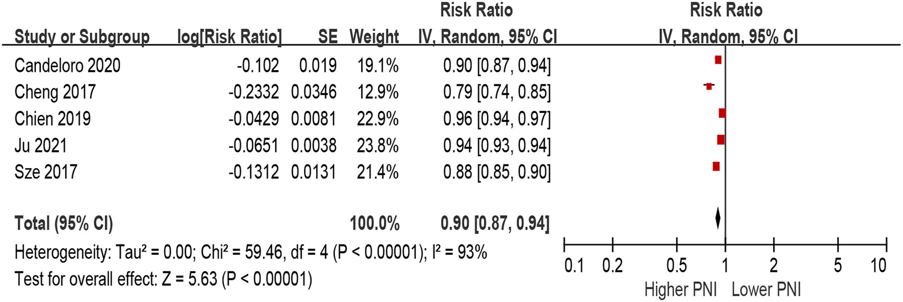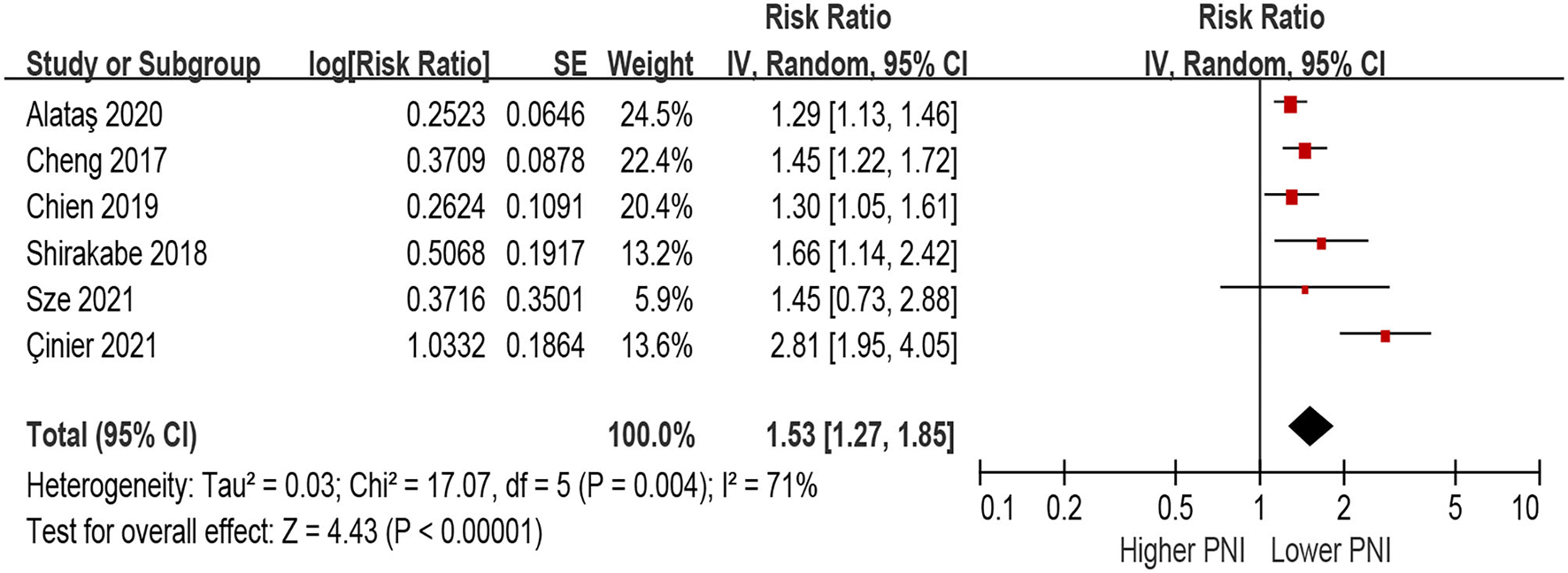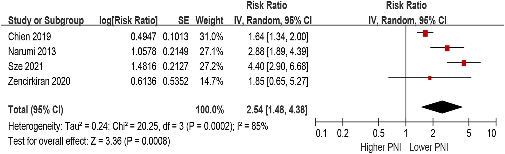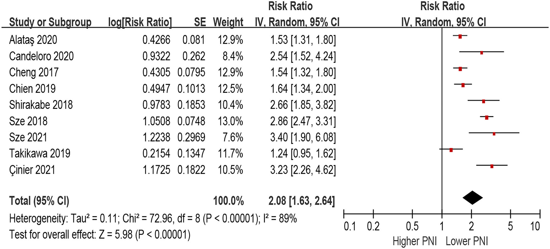 Only two studies defined PNI as per 1 increment as a continuous metric and evaluated the association between the risk of MACEs. Higher PNI was associated with a decrease of MACEs in the unadjusted model (per 1 increment of PNI: HR 0.95, 95% CI 0.91–1, Supplementary File 3), as well as in the multivariable-adjusted model (per 1 increment of PNI: HR 0.97, 95% CI 0.95–0.98, Supplementary File 4).