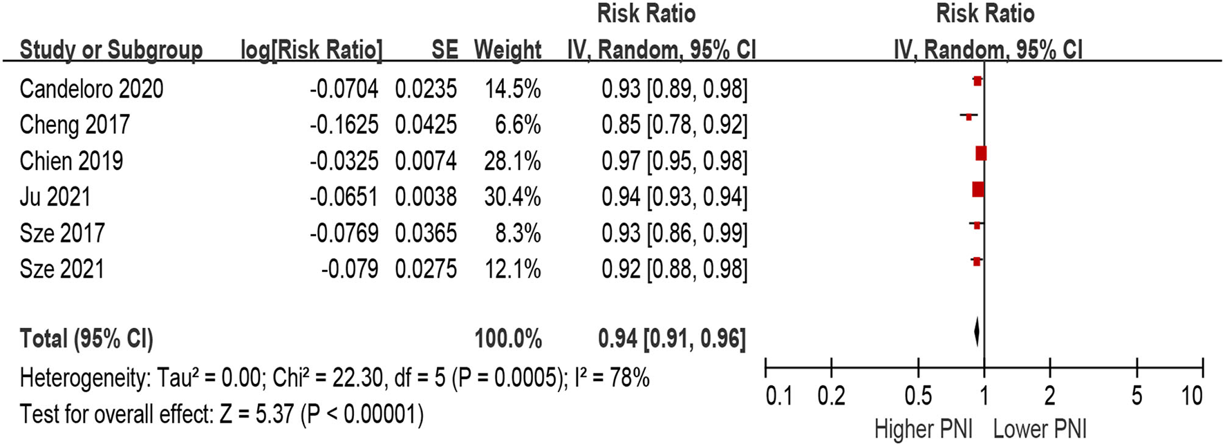 When PNI was defined as per 1 increment as a continuous metric, we observed that higher PNI was associated with a decrease in all-cause mortality in the unadjusted model (per 1 increment of PNI: HR 0.90, 95% CI 0.87–0.94; I2 = 93%, P for heterogeneity <0.001; Figure 4), as well as in the multivariable-adjusted model (per 1 increment of PNI: HR 0.94, 95% CI 0.88–0.96; I2 = 78%, P for heterogeneity <0.001; Figure 5).