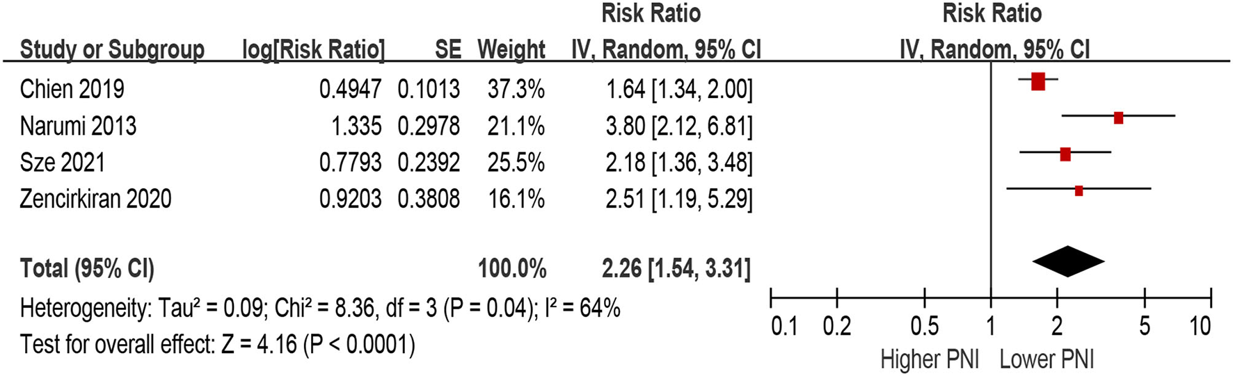 Patients with lower PNI were associated with a 154% increase in MACEs (HR 2.54, 95% CI 1.48–4.38; I2 = 85%, P for heterogeneity <0.001), compared with those with higher PNI in the unadjusted model (Figure 6). In the multivariable-adjusted model, lower PNI was still associated with an increased risk of MACEs (HR 2.26, 95% CI 1.54–3.31; I2 = 64%, P for heterogeneity = 0.04; Figure 7).