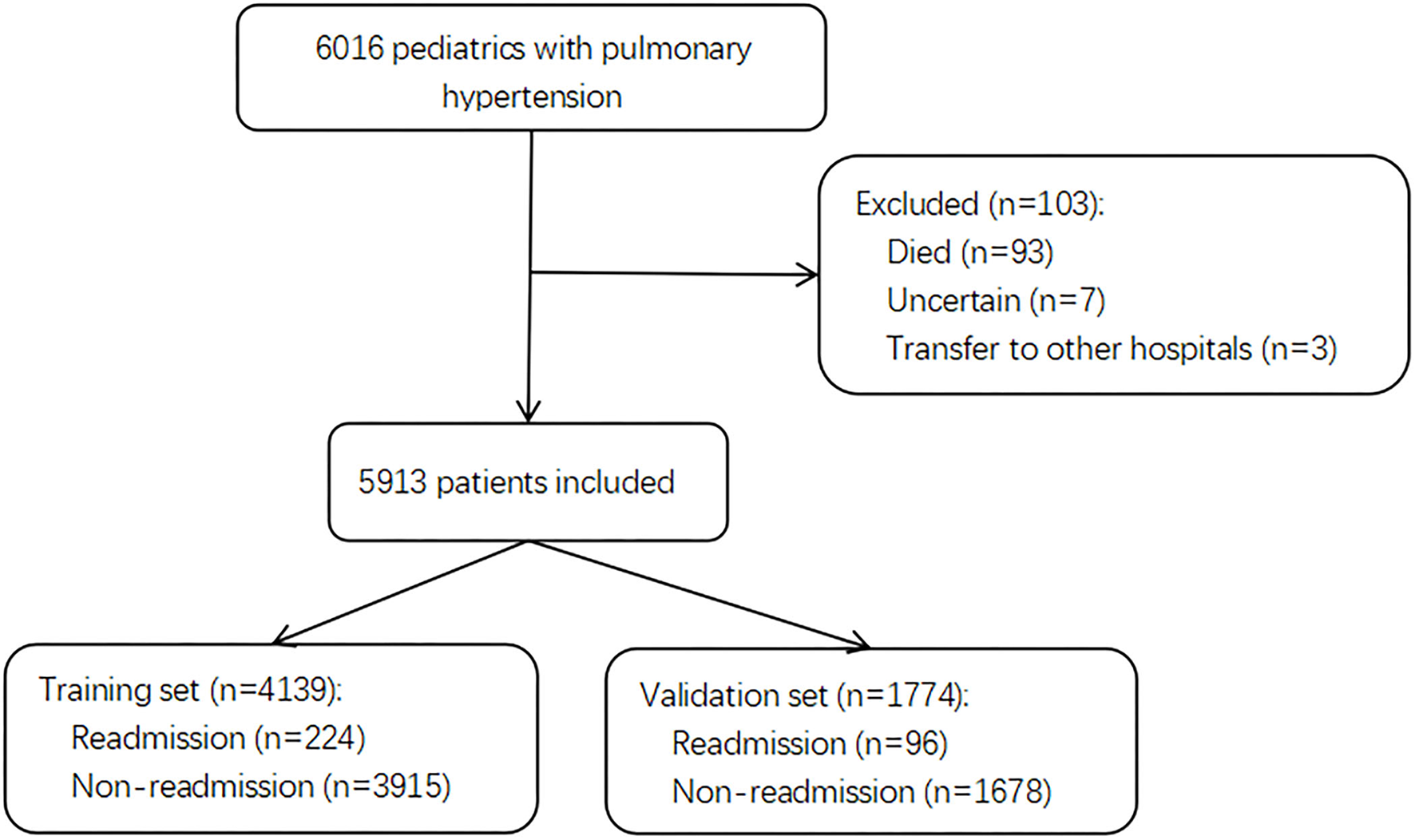 Of 6,016 pediatric inpatients diagnosed with PH, 103 patients were excluded due to death, transfer to other hospitals, and uncertain discharge during initial admission. A total of 5,913 pediatric patients with PH were included in the final cohort and divided into a training set with 4,139 patients for model building and a validation set with 1,774 patients for testing. The selection flow chart is shown in Figure 1. In total, there were 320 (5.4%) pediatric patients with PH re-admitted within 30 days after index discharge and 5,780 (98%) patients associated with the etiology of congenital heart disease (CHD). The median age was 0.11 years (0.00, 0.60) in total patients, with a proportion of boys of 3,255 (55%). The differences in characteristics between readmission and non-readmission groups are described in Table 1. In the training set and test set, 224 (5.4%) and 96 (5.4%) patients were readmitted within 30 days in this study individually. The baseline characteristics of patients in the two sets are presented in Supplementary Tables 1 and 2, respectively. The baseline characteristics between the training set and validation set are shown in Supplementary Table 3.