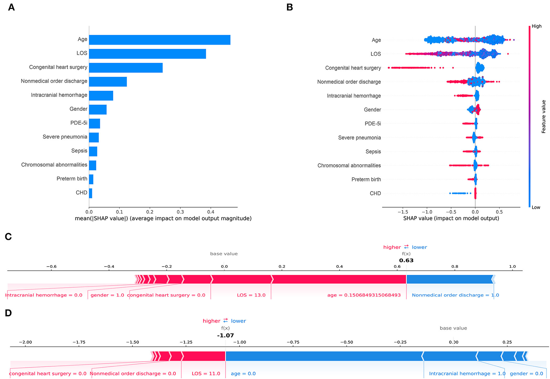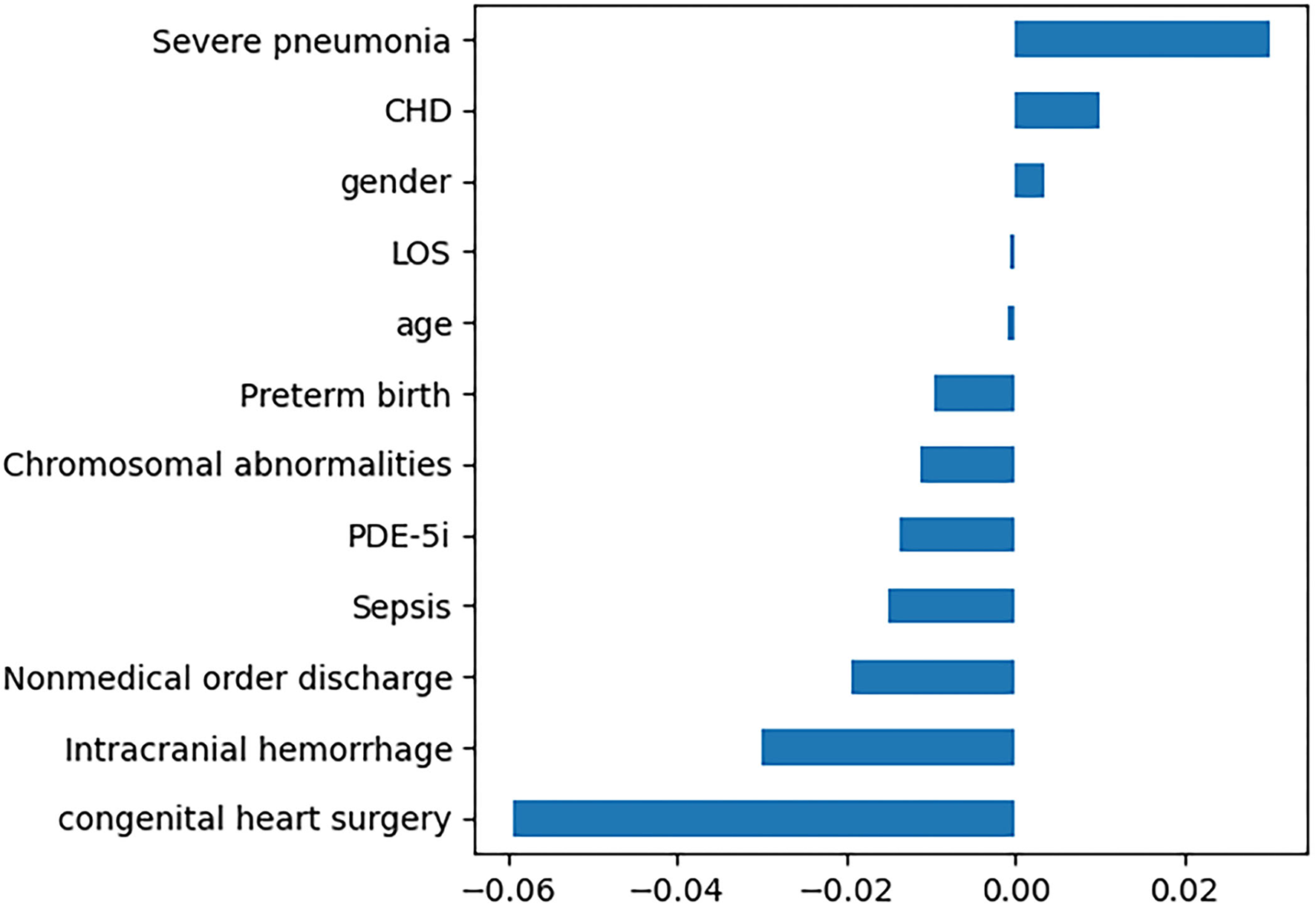 Twelve features with non-zero regression coefficients. LOS, length of stay; PDE-5i, phosphodiesterase 5 inhibitors; CHD, congenital heart disease.