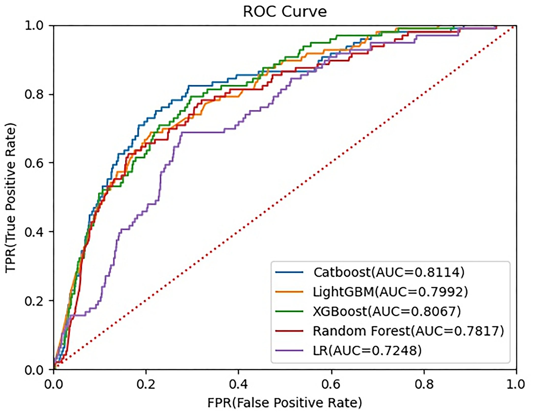 The results of 15 algorithms are exhibited in Table 2. In this study, accuracy and AUC were defined as the main parameters to evaluate the models' performance. The top four algorithms with excellent performance (accuracy > 0.9 and AUC > 0.7) were selected to develop the readmission prediction models, such as eXtreme Gradient Boosting (XGBoost), Random Forest, Categorical Boosting (CatBoost), and Light Gradient Boosting Machine (LightGBM). Logistic Regression (LR), a traditional statistical model, was selected as a comparison in this study.