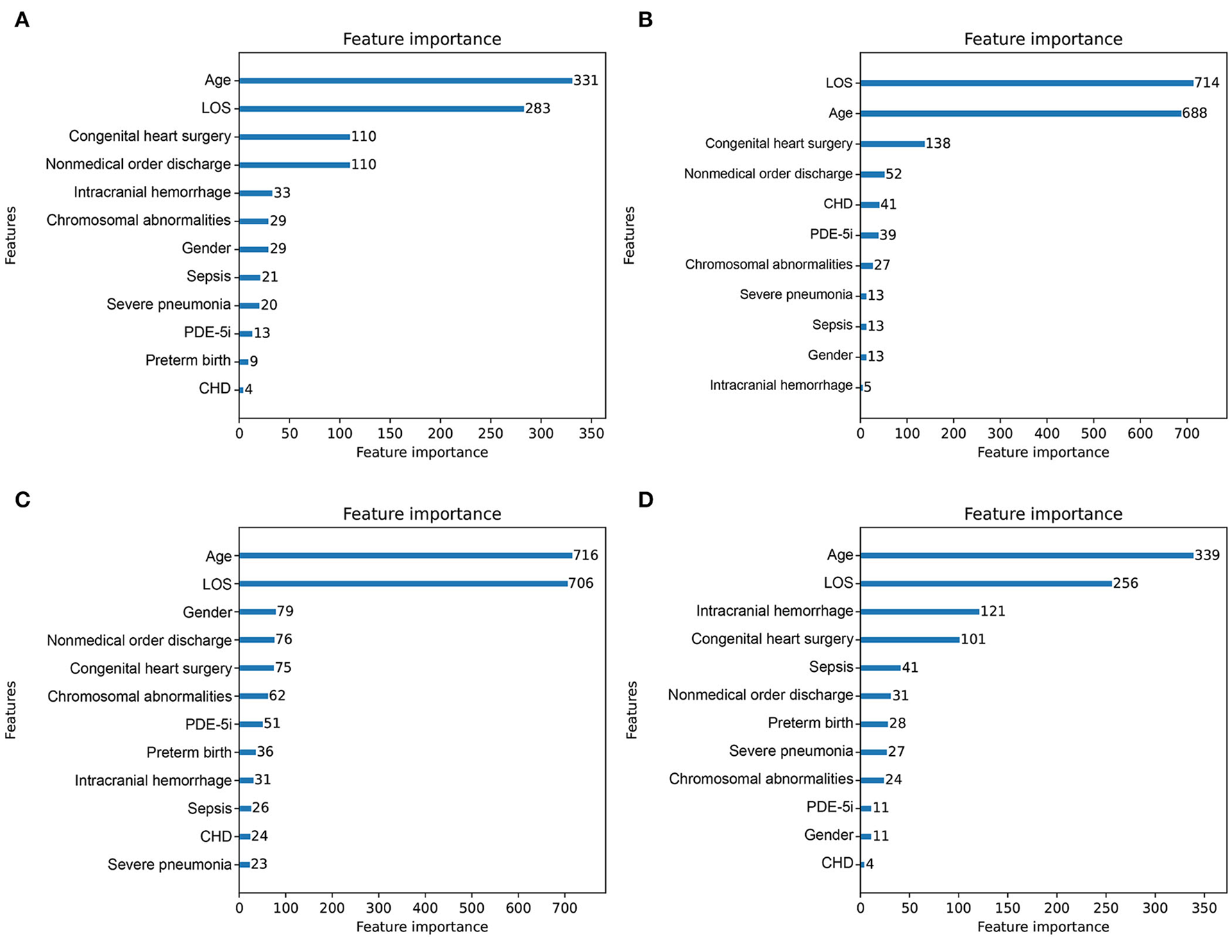 In this study, 12 features with non-zero regression coefficients were selected to construct predictive models through LASSO feature selection analysis shown in Figure 2, such as severe pneumonia, CHD, gender, LOS, age, preterm birth, chromosomal abnormalities, phosphodiesterase 5 inhibitors (PDE-5i), sepsis, nonmedical order discharge, intracranial hemorrhage, and congenital heart surgery. Bayesian optimization was conducted to optimize the hyperparameters.