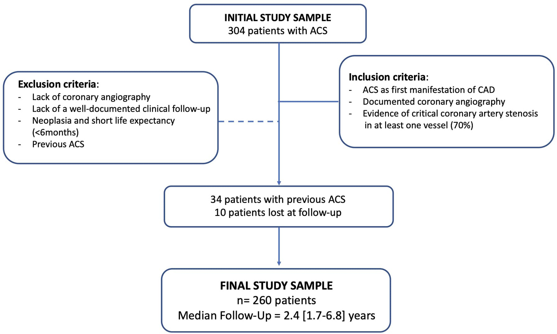 Out of 304 originally enrolled patients, 260 individuals had their hospitalization for a first ACS episode at our institution and were subsequently followed. The remaining 44 patients had already experienced a first ACS episode before admission at our hospital (n = 34) or were lost at follow-up (n = 10). A total of 260 CAD patients were finally included in the analysis (Figure 1).