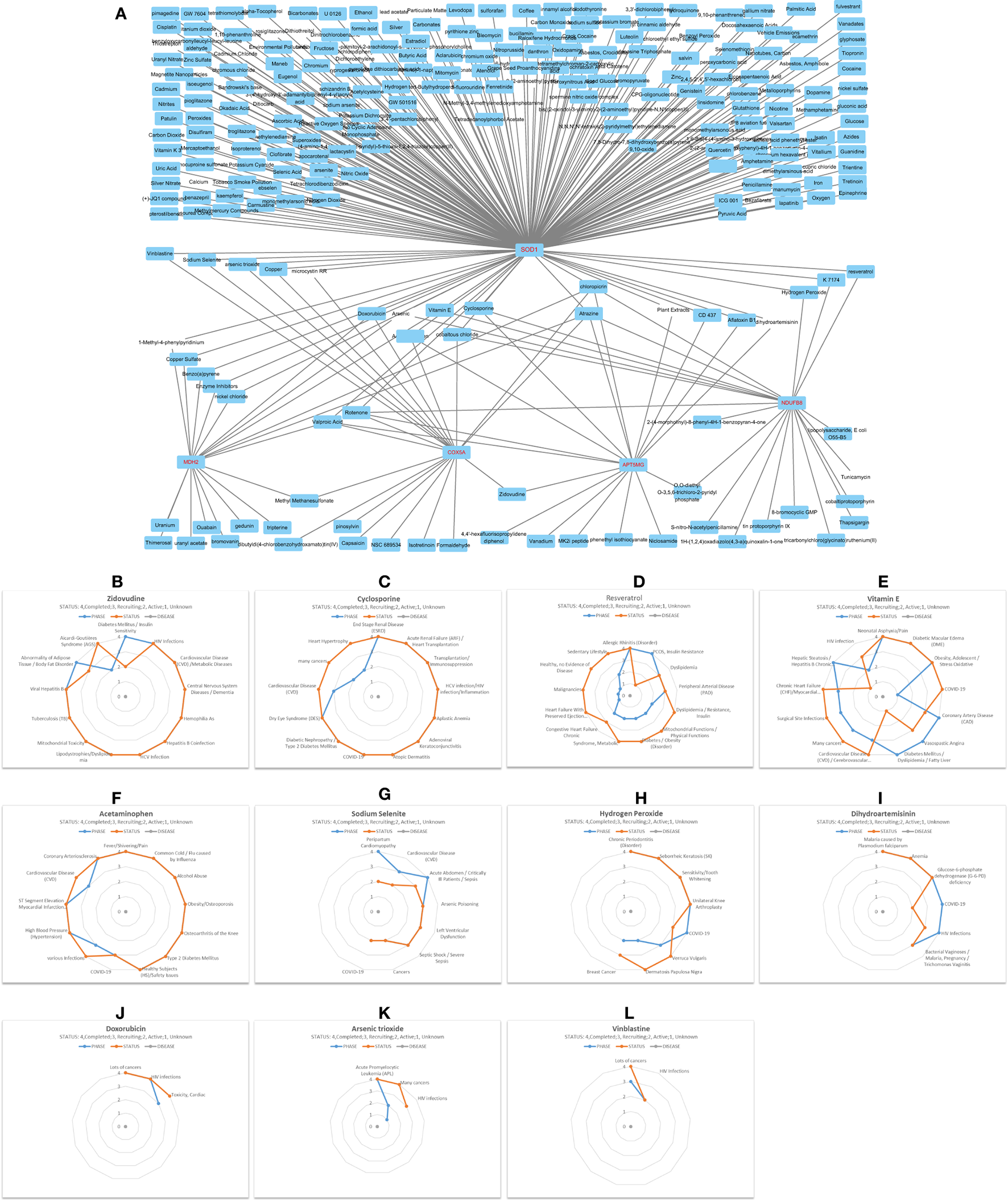 Figure 7. Decipher chemicals (drugs) targeted critical network genes. (A) Mine 251 chemicals targeted the five coding genes in the ATP5MG-related network. (B) Clinical trials of Zidovudine. (C) Clinical trials of Cyclosporine. (D) Clinical trials of Resveratrol. (E) Clinical trials of Vitamin E. (F) Clinical trials of Acetaminophen. (G) Clinical trials of Sodium selenite. (H) Clinical trials of Hydrogen peroxide. (I) Clinical trials of Dihydroartemisinin. (J) Clinical trials of Doxorubicin. (K) Clinical trials of Arsenic trioxide. (L) Clinical trials of Vinblastine.