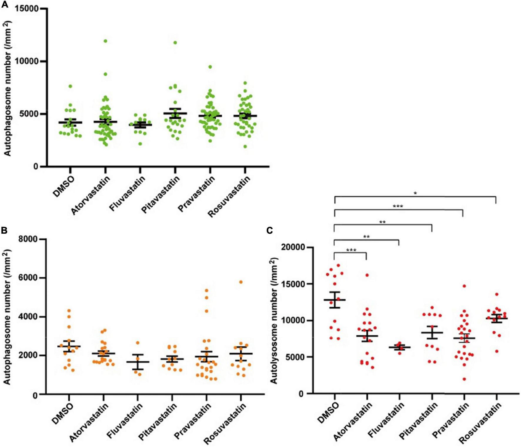 Figure 6. The densities of autophagosomes and autolysosomes in zebrafish cardiomyocytes are quantified when treated with statins. (A) Quantification of the density of autophagosomes in 3-dpf zebrafish heart of Tg(myl7:EGFP-LC3) line when treated with indicated statins. (B) Quantification of the densities of autophagosomes in 3-dpf zebrafish heart of Tg(myl7:mRFP-EGFP-LC3) line when treated with indicated statins. (C) Quantification of the densities of autolysosomes in 3-dpf zebrafish heart of Tg(myl7:mRFP-EGFP-LC3) line when treated with indicated statins. The data are shown as mean ± s.e.m for each group. n = 13 in the control group, n = 19 in the atorvastatin group, n = 4 in the fluvastatin group, n = 11 in pitavastatin, n = 24 in the pravastatin group, and n = 13 in the rosuvastatin group. *p < 0.05, **p < 0.01, ***p < 0.001.