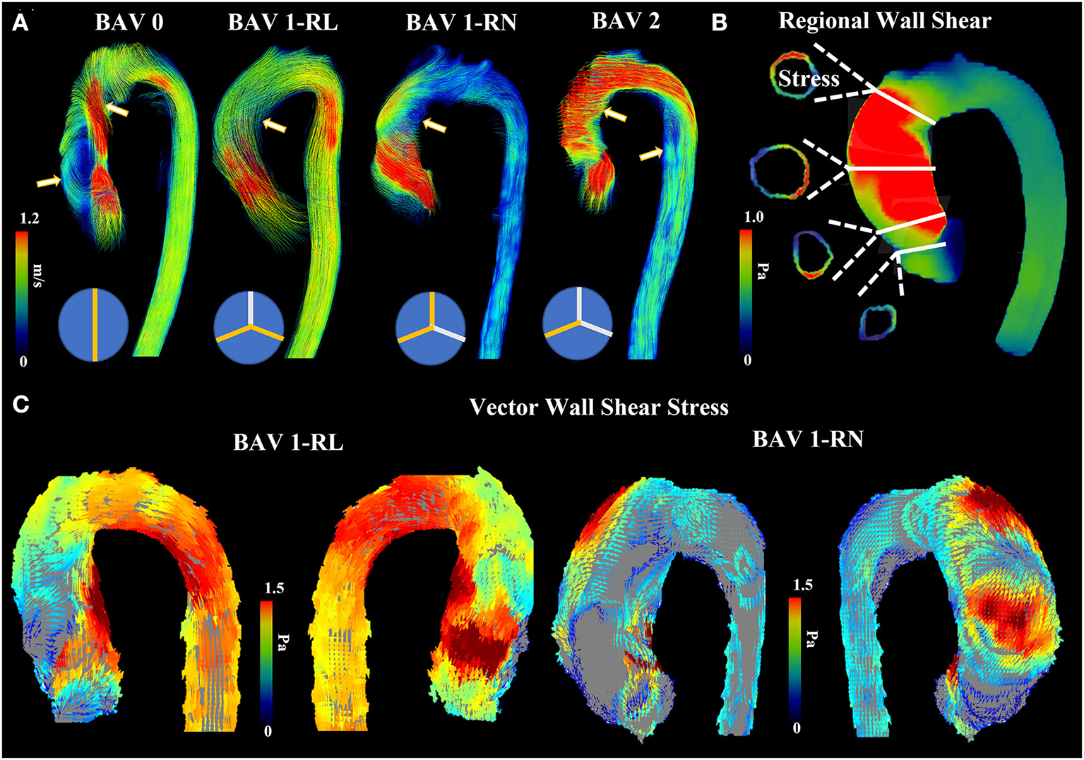 Abnormal bicuspid aortic valve (BAV) hemodynamics. (A) shows four patients with different BAV phenotype. Arrows point to regions where helical and abnormal flow patterns can be observed. (B) shows an example of regional wall shear stress in the ascending aorta. Four landmark locations are illustrated: left ventricular outflow tract, sinus of Valsalva, mid-ascending aorta, and distal ascending aorta. (C) shows anterior and posterior view from vectorial wall shear stress in RL and RN patients.