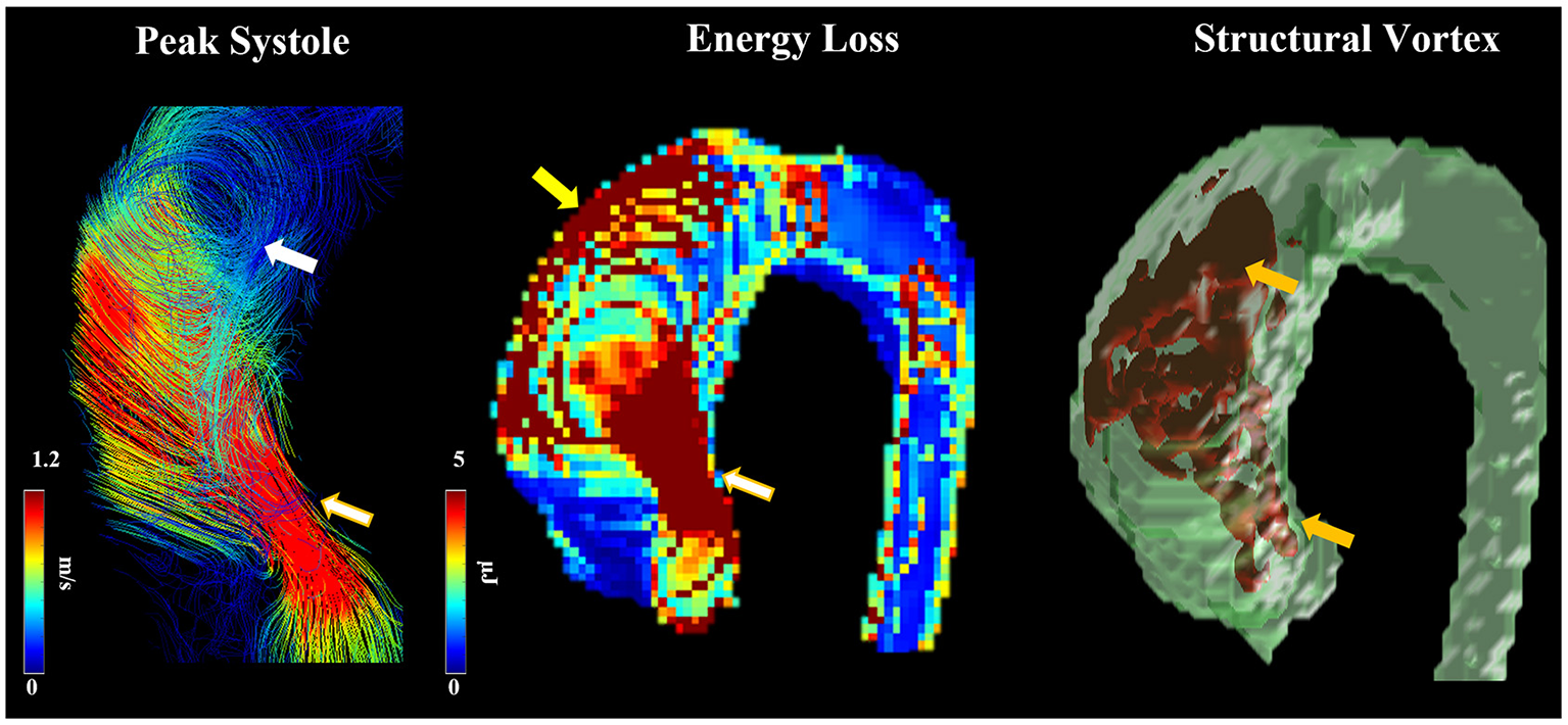 Abnormal helical flow and dilation. Flow patterns at peak systole were observed in a patient with RN fusion. Arrows point to regions with high helicity (white arrow) and vorticity (orange arrows), abnormal jet (white-golden arrows), elevated energy loss due to flow impingement (yellow arrow).