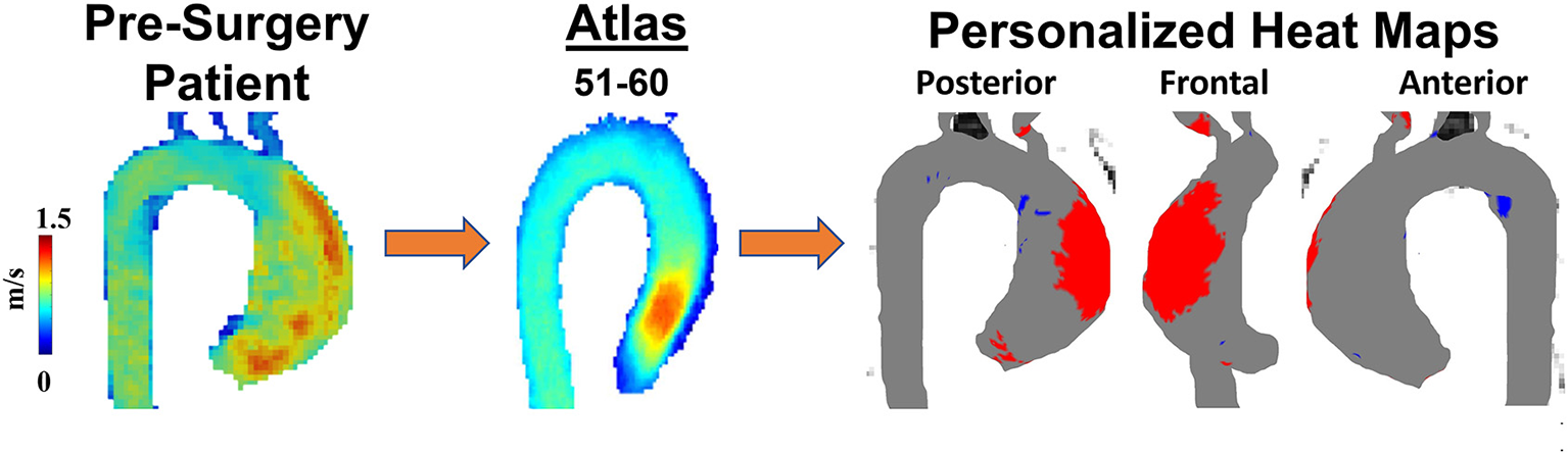 Personalized heat maps. A 60-year-old man with BAV Type 1 RL phenotype was scanned to obtain 4D flow velocities prior to surgical planning. Patient's velocity field was compared with an age and sex-match atlas allowing to identify abnormal regions (high wall shear stress in red, low wall shear stress in blue) of wall shear stress using heat maps.