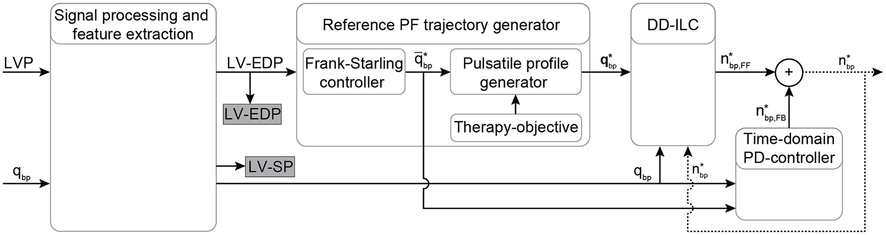 The proposed PDD-ILC scheme for LVADs aims to provide an accurate reference tracking of predefined, therapy-oriented, PF profiles while it achieves physiological VAD response when preload changes are encountered. A schematic overview of the PDD-ILC structure is depicted in Figure 1 and it can be divided into four main subsystems, namely, signal processing and feature extraction, reference PF trajectory generator, DD-ILC, and time-domain PD-controller.