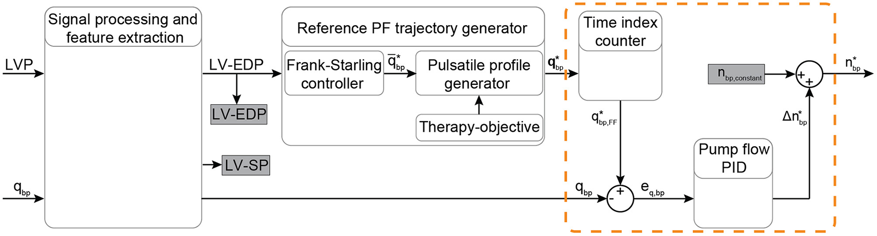 Schematic overview of the physiological flow PID controller. The input signals LVP and PF are filtered and the EDP and SP indices are extracted from the LVP. Based on the Frank-Starling mechanism, the average PF is calculated based on the LV-EDP that is used as a preload surrogate, and the reference pulsatile PF trajectory is obtained based on the objectives of the therapy. A time index counter operates continuously to extract and output the feedforward PF setpoint at every time step. A PID flow controller (included in the orange dashed-line box) provides the necessary change in the pump speed setpoint based on the error between the measured and the desired PF. The desired pump speed is the output of the controller. Bold letters define vectors. LVP, left ventricular pressure; EDP, end-diastolic pressure; SP, systolic pressure; PF, pump flow; PID, proportional-integral-derivative; qbp, measured pump flow; , heart cycle average pump flow; , time vector of the desired pump flow trajectory; , feed forward desired pump flow; eq, bp, feedback error between the measured and the desired PF; , desired pump speed change; nbp,constant, pump speed constant; , desired pump speed output.