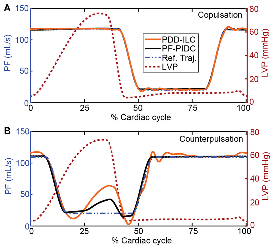 Reference trajectory tracking performance of the PDD-ILC and the PF-PIDC during one cardiac cycle of the rest-conditions experiment (Exp0, Supplementary Table S1, Supplementary Material) under (A) copulsation and (B) counterpulsation. The reference trajectories, along with the left ventricular pressure profile that corresponds to the main source of disturbance are given for both modes. Both controllers are able to track accurately the reference trajectory during copulsation, reaching the maximum and minimum PF values without time lag. During the counterpulsation, the high disturbance of the fast change in LVP cannot be compensated completely from any of the controllers, however, the overall tracking is adequate. PDD-ILC, physiologic data-driven iterative learning controller; PF-PIDC, pump flow proportional-integral-derivative controller; Ref. Traj., reference trajectory; LVP, left ventricular pressure.