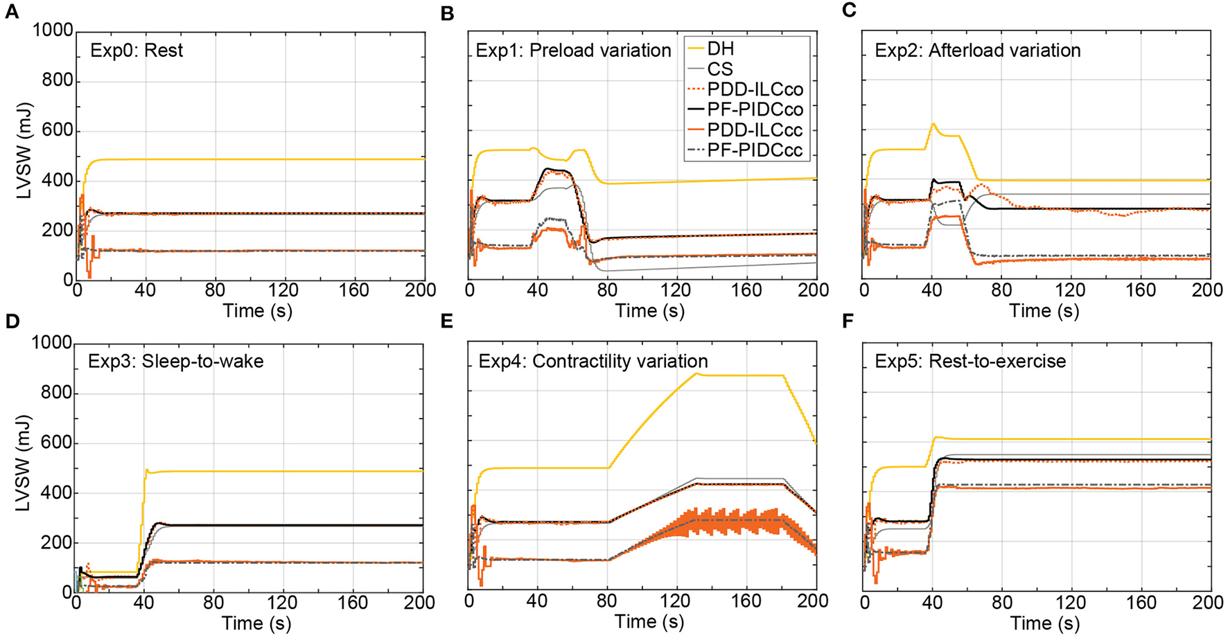 Influence of the copulsation and counterpulsation modes on the left ventricular stroke work (LVSW) of the diseased heart (DH) during: (A) Rest-conditions (Exp0), (B) Preload variation (Exp1 (C) Afterload variation (Exp2) (D) Sleep-to-wake (Exp3) (E) Contractility variation (Exp4) (F) Rest-to-exercise (Exp5). DH, diseased heart; CS, constant speed control; PDD-ILCco, physiologic data-driven iterative learning controller copulsation; PF-PIDCco, pump flow proportional-integral-derivative controller copulsation; PDD-ILCcc, physiologic data-driven iterative learning controller counterpulsation; PF-PIDCcc, pump flow proportional-integral-derivative controller counterpulsation.