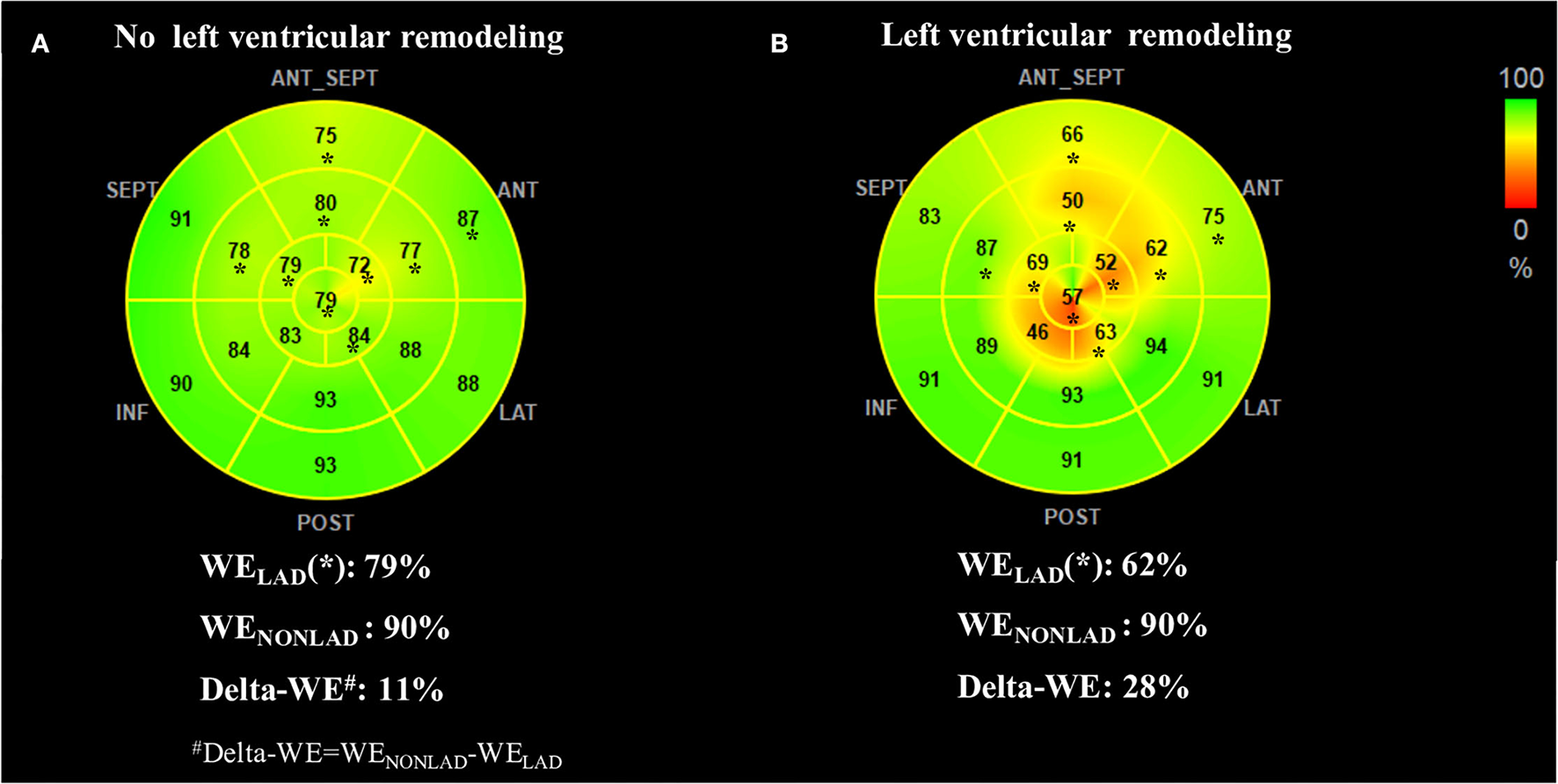 MW indices at the acute phase are presented in Table 3. The patients with LV remodeling presented with lower values of GWI (763 ± 206 mmHg% vs. 927 ± 254 mmHg%, P = 0.002), GWE (78 [range, 74–82] % vs. 84 [range,79–89] %; P < 0.001), and GCW (970 ± 229 mmHg% vs. 1,179 ± 261 mmHg%, P < 0.001) compared with those without LV remodeling. Similarly, significantly reduced regional WI-LAD (671 ± 242 mmHg% vs. 864 ± 280 mmHg%, P = 0.001), WE-LAD, (71% ± 9% vs. 80% ± 8%, P < 0.001) and CW-LAD (667 [range, 530–911] mmHg% vs. 985 [range, 807–1,183] mmHg%; P < 0.001) were observed in the LV remodeling group, while there was no difference for MW indices in the non-culprit territory between the two groups. Although the values of GWW (227 ± 75 mmHg% vs. 189 ± 75 mmHg%, P = 0.022) and WW-LAD (264 ± 105 mmHg% vs. 214 ± 92 mmHg%, P = 0.018) had an increased tendency in the LV remodeling group than the group without LV remodeling, there were no significant differences between the two groups. Of note, the difference of regional WE and regional CW between the culprit territory and the non-culprit territory at acute phase were higher in patients with LV remodeling compared with that in patients without LV remodeling, as indicated by higher delta-WE (20 [range, 11–26] % vs. 9 [range, 3–15] %; P < 0.001) and delta-CW (587 ± 262 mmHg% vs. 425 ± 245 mmHg%, P < 0.004). Figure 3 shows the representative bull's-eye plots for regional WE distribution of patients with and without early LV remodeling.