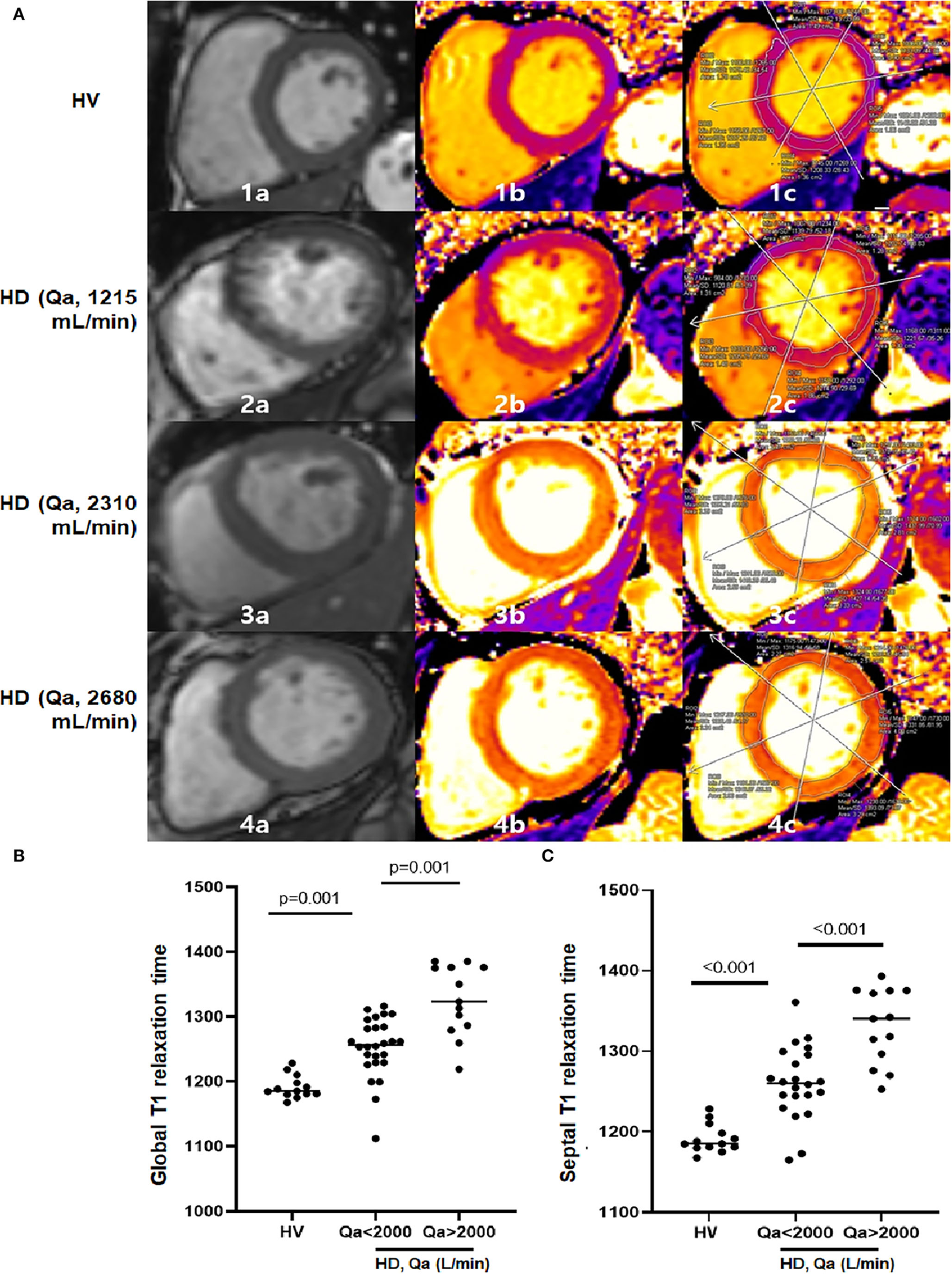 As myocardial fibrosis has been proven reversible and treatable only under timely intervention, risk identification and early detection of myocardial fibrosis can be extremely important in HD patients. In this regard, we focused on the association between high intra-access Qa and the extent of myocardial fibrosis in chronic HD patients. For detection of myocardial fibrosis in HD patients, non-contrast cardiac magnetic resonance imaging (MRI) and circulating biomarker have been widely used (16, 22, 23) as the use of gadolinium contrast is challenging in this population given the association between gadolinium and nephrogenic systemic fibrosis (24, 25). Indeed, non-contrast native T1 relaxation time, which is correlated with cardiac fibrosis found on tissue histology, is emerging as a feasible alternative to the use of gadolinium contrast for many patients including those with CKD and HD (12, 23).