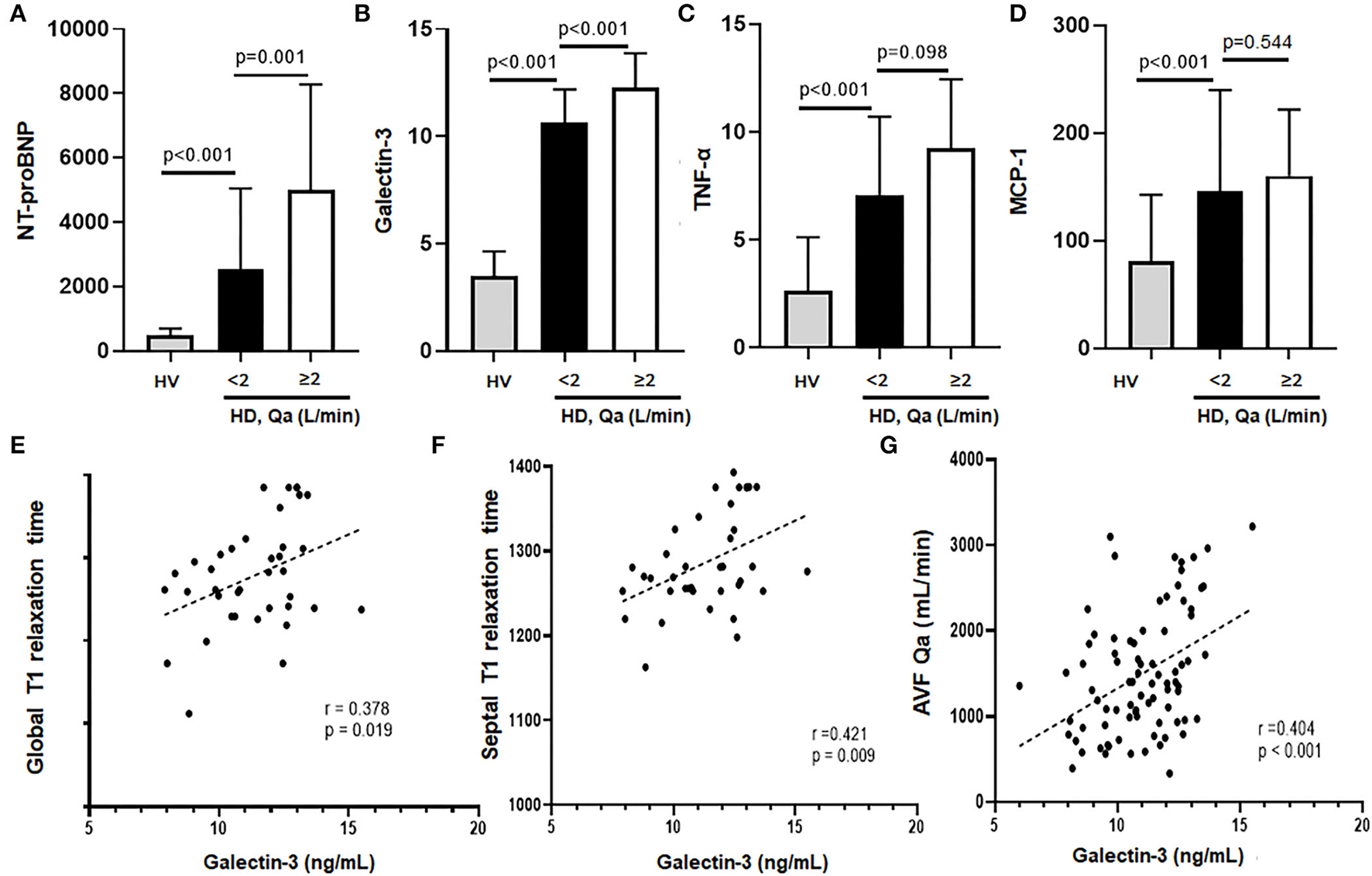 Hemodialysis patients showed significantly higher galectin-3 value and increased T1 relaxation time compared to healthy volunteers, suggesting increased myocardial fibrosis in uremic cardiomyopathy. In HD patients, 20 (19.8%) had a Qa > 2L/min, and they had significantly higher cardiac output, cardiac index, left ventricular mass, and increased T1 times than those with a Qa ≤ 2 L/min. Also, serum galectin-3 and NT-proBNP levels were much higher in the high Qa group, indicating a close relationship between the high Qa, increased myocardial fibrosis, and the risk of heart failure (HF) in HD patients. It is interesting that a higher AVF Qa for myocardial fibrosis was independent of several traditional cardiovascular risk factors as well as serum levels of NT-proBNP and MCP-1.