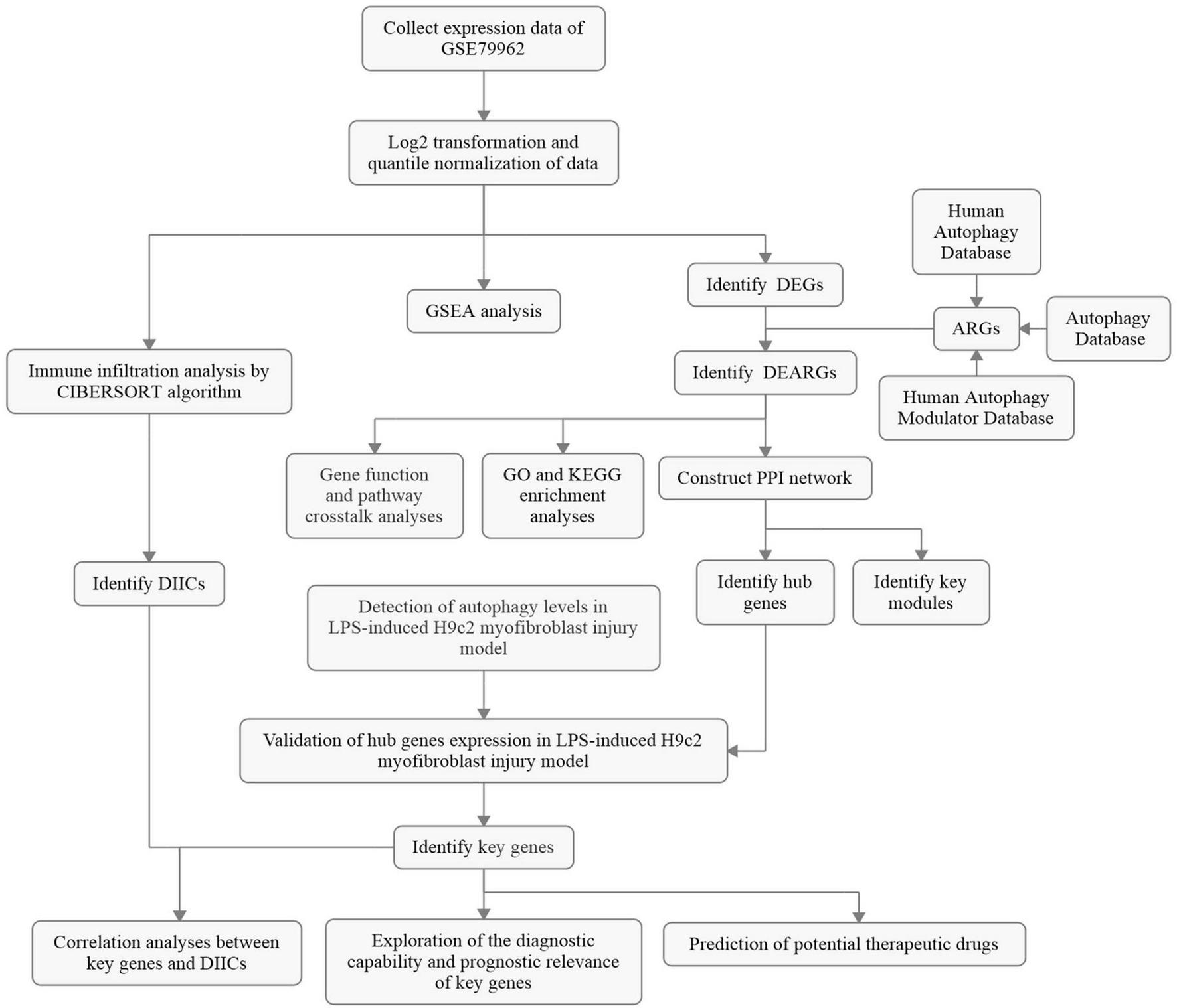 Exploring the molecular biology of disease based on the transcriptomes of human pathological tissues may bring the closest realistic insight, which has already been applied in various disease studies and transformed into clinical benefits (28–30). In this study, we analyzed the differential expression of autophagy-related genes (ARGs) in SCM based on the transcriptomes of human septic heart samples and further explored their potential crosstalk and functional pathways. Key functional module and hub genes were identified by constructing a protein–protein interaction (PPI) network, and the expression of hub genes was validated in a lipopolysaccharide (LPS)-induced H9c2 cardiomyoblast injury model, as well as the autophagic characteristic features. We subsequently explored the diagnostic capability and prognostic relevance of key genes for sepsis in whole blood transcriptomic data from independent cohorts. In addition, given the close association between SCM and the immune response, we performed immune correlation analysis on the identified key genes (8, 31). Finally, we predicted potential therapeutic drugs based on key genes for further exploration.