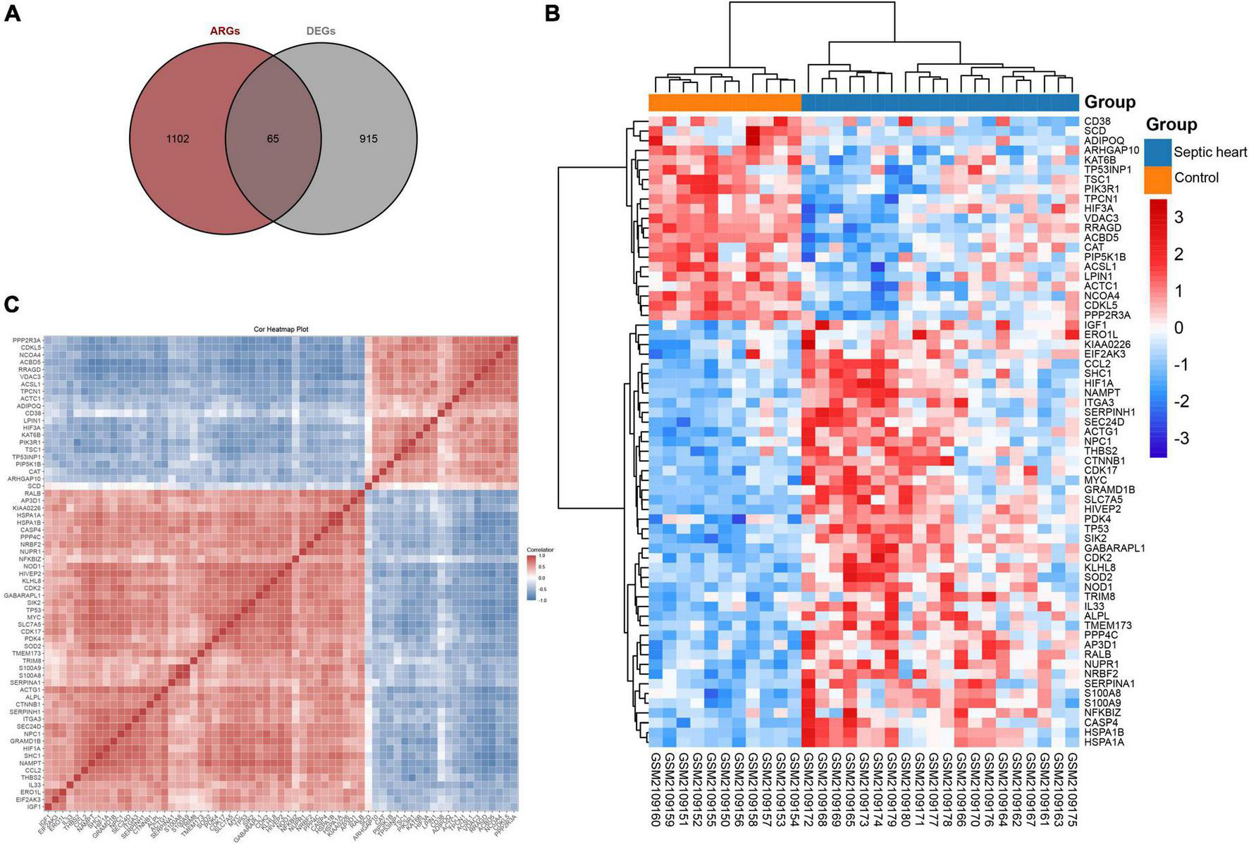 Since the GSEA results showed significant expression variations of ARGs in the septic heart transcriptomes, we further identified DEARGs. After deduplication of genes, a total of 1,167 ARGs were identified from autophagy-related databases. A total of 65 ARGs overlapped with the DEGs in GSE79962, which we identified as DEARGs for further analysis (Figure 3A), as listed in Supplementary Table 4. The clustered heatmap and correlation heatmap showed the expression differences of 65 DEARGs between septic and control hearts, as well as the correlation between DEARGs (Figures 3B,C).