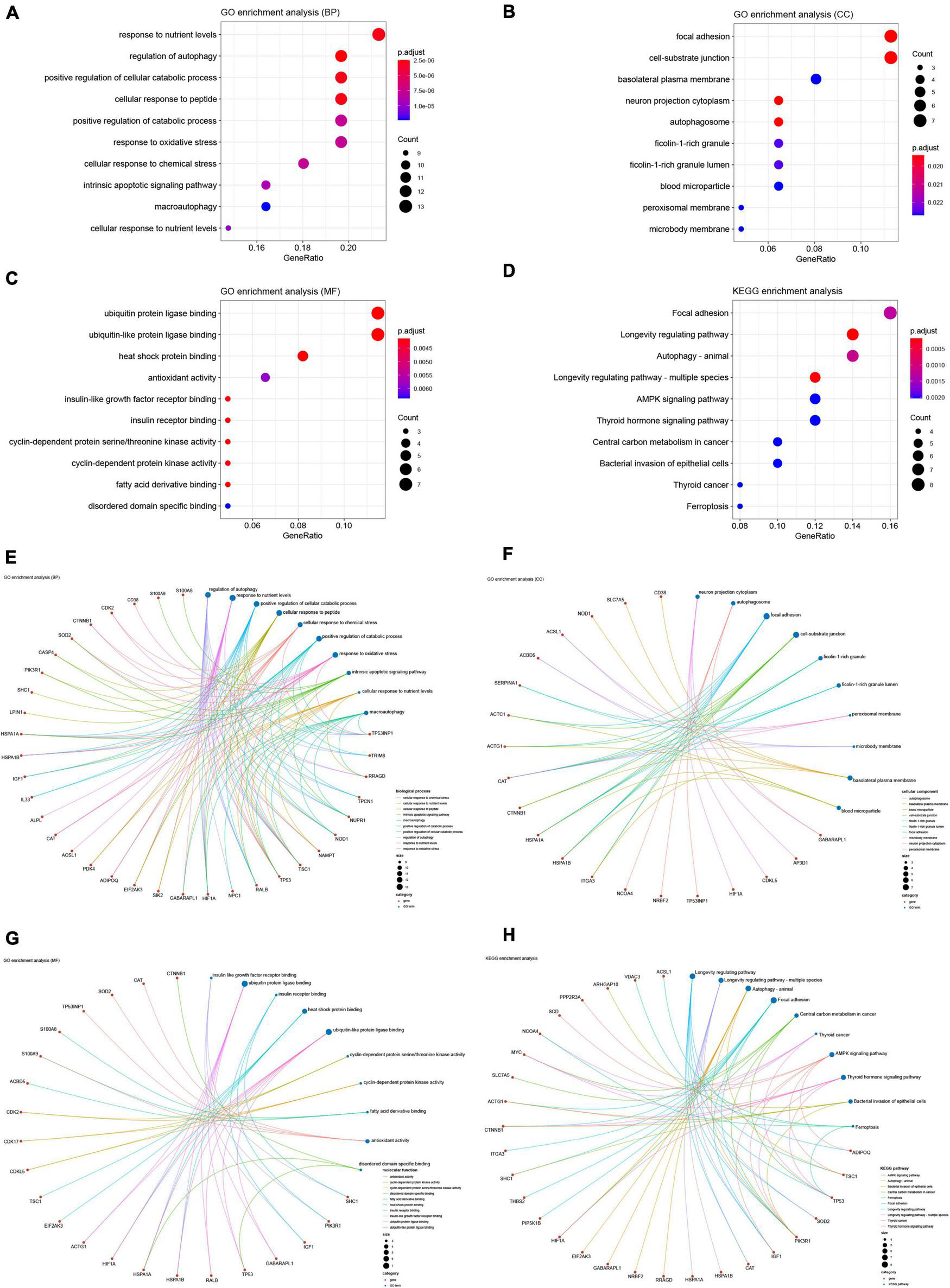 Gene Ontology (GO) and Kyoto Encyclopedia of Genes and Genomes (KEGG) enrichment analyses of differentially expressed ferroptosis-related genes. GO enrichment analysis of DEARGs in (A) the biological process category (BP); (B) the cellular component category (CC); (C) the molecular function category (MF). (D) KEGG enrichment analysis of DEARGs. Crosstalk analysis between DEFRGs and (E) gene functions in BP; (F) gene functions in CC; (G) gene functions in MF; (H) KEGG pathways. DEARG, differentially expressed autophagy-related gene.