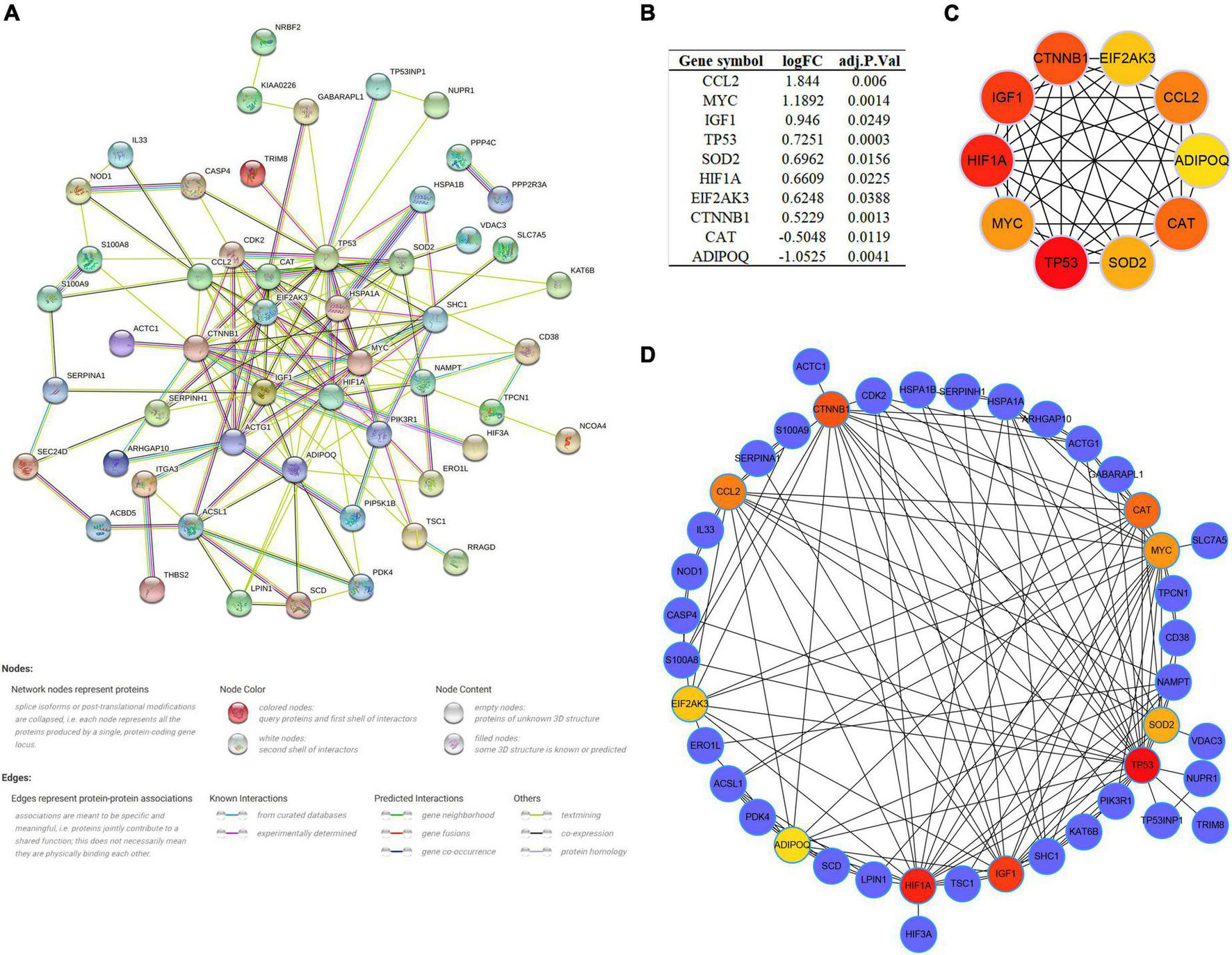 As multiple gene functions and pathways are involved and crosstalked in the regulatory role of ARGs in SCM, we constructed and analyzed the PPI network of DEARGs using the STRING database and Cytoscape software to find the functional module and key genes among them (Figure 5A). Finally, one key module was identified by the MCODE plugin (Supplementary Figure 2), and the top 10 genes (CCL2, MYC, IGF1, TP53, SOD2, HIF1A, EIF2AK3, CTNNB1, CAT, and ADIPOQ) ranked by the MCC algorithm of the Cytohubba plugin were selected as hub genes. Interestingly, the key module completely overlapped with the hub genes we identified, which further demonstrated that these hub genes are the major functional clusters of DEARGs. Figure 5B shows the differential expression of hub genes in septic hearts, while Figures 5C,D show the multiple associations between hub genes and with other DEARGs. The scores of all DEARGs in the PPI network calculated by the Cytohubba plugin are listed in Supplementary Table 5.