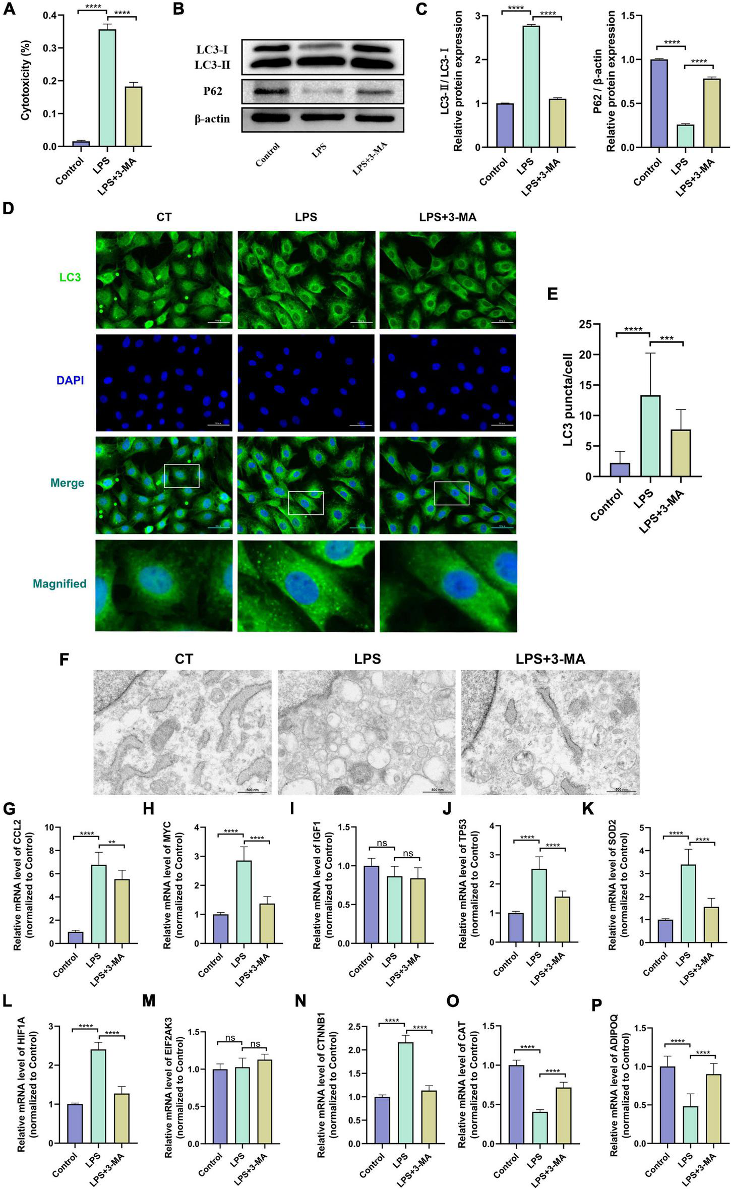 (A) Altered autophagy level and validation of hub gene expression in LPS-induced H9c2 myofibroblast injury model. H9c2 myofibroblasts were treated with LPS (10 μg/ml) for 24 h in the presence or absence of 3-MA (5 μM) pretreatment, followed by subsequent experiments. (A) Cytotoxicity determined by the release of lactate dehydrogenase. (B) Representative western blotting bands of LC3 and P62. (C) The LC3-II/I ratio and the relative protein levels of P62 estimated by ImageJ software. (D) Representative images of LC3B immunofluorescence in H9c2 myofibroblasts. (E) The Ratio of the number of LC3 puncta to the number of cells in each group. (F) Representative images of transmission electron microscopy in H9c2 myofibroblasts. (G–P) mRNA expression levels of hub genes detected by qRT-PCR. LPS, lipopolysaccharide; 3-MA, 3-methyladenine. **p < 0.01, ***p < 0.001, ****p < 0.0001, ns = not significant. Data are presented as the mean ± SD, n ≥ 3.