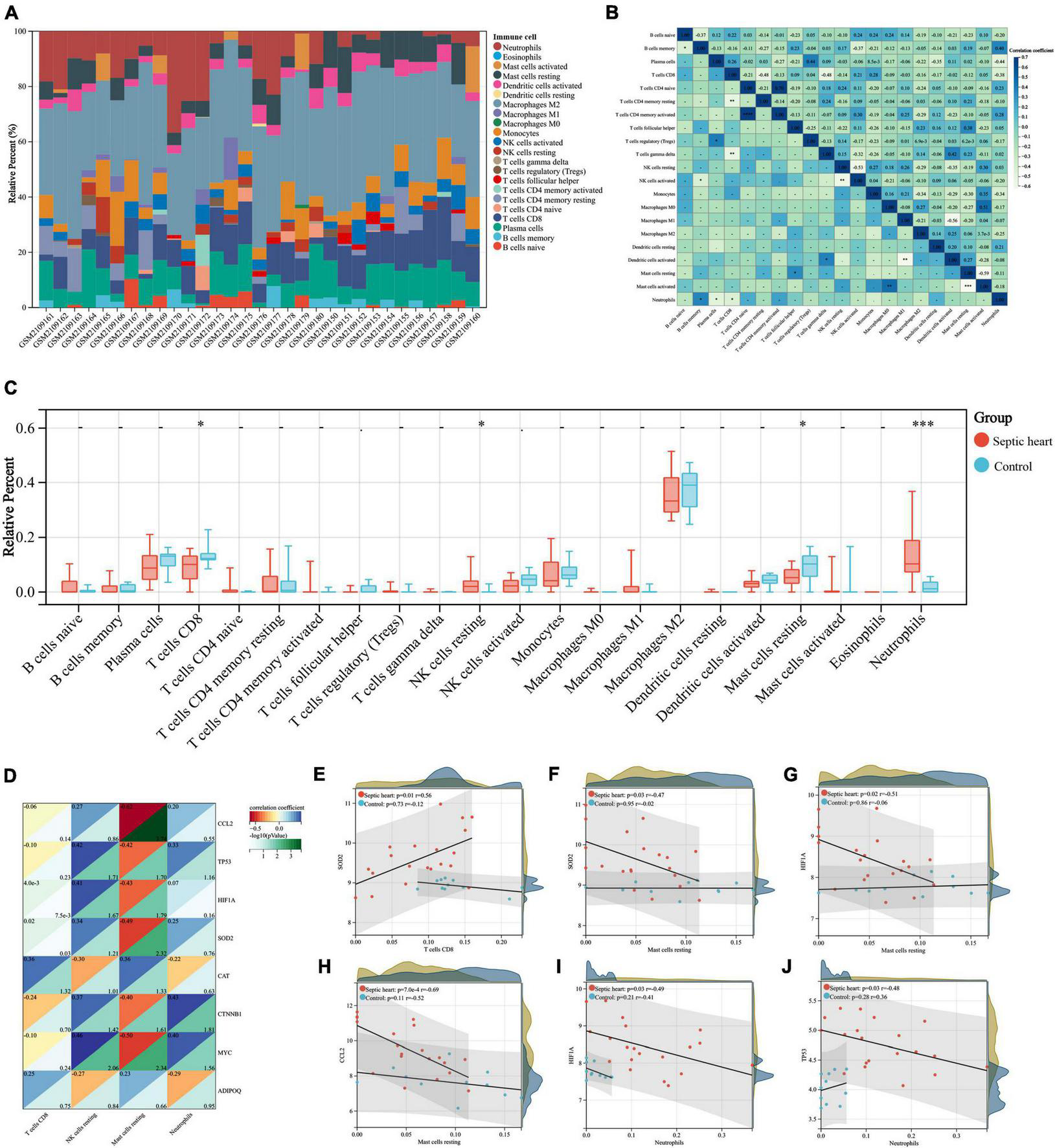 (A) Correlation analyses between key genes and DIICs. The proportion of infiltrating immune cells of the samples from GSE79962 by the CIBERSORT algorithm. (B) Correlation heatmap of DIICs in GSE79962, correlation coefficients are plotted with negative correlation (green) and positive correlation (blue). (C) Comparison of infiltrating immune cells between septic and normal hearts in GSE79962. (D) Correlation heatmap of DIICs and key genes in GSE79962, correlation coefficients are plotted with negative correlation (red) and positive correlation (blue), while p values are negatively correlated with greenness. (E–J) Linear regression plots presenting the significant correlation between key genes and DIICs. DIIC, differentially infiltrating immune cell. *p < 0.05, **p < 0.01, ***p < 0.001, ns = not significant.