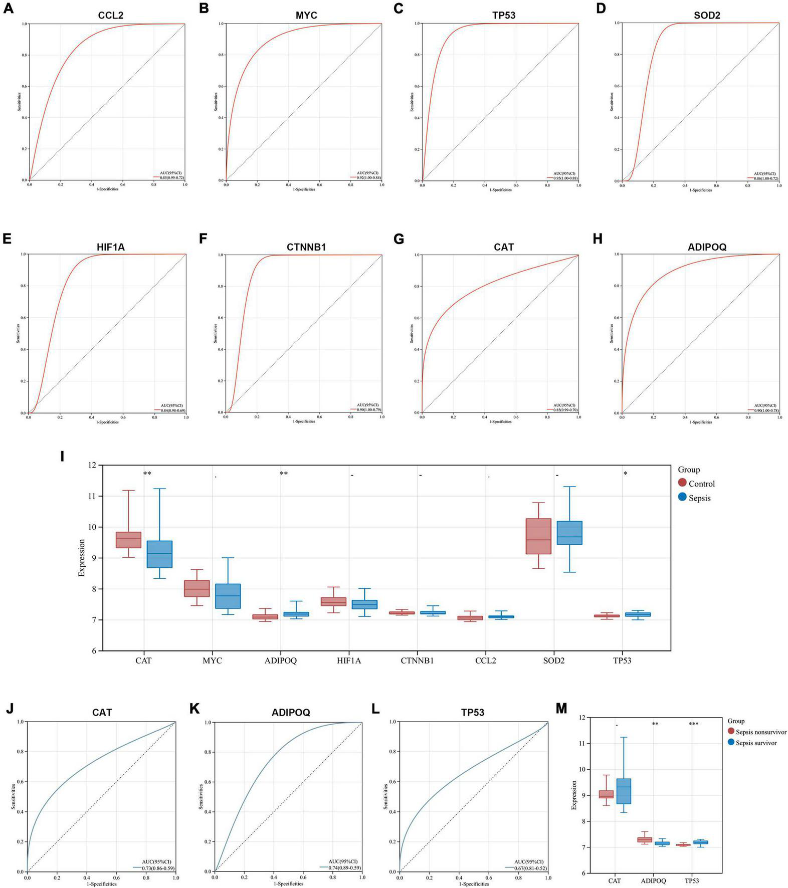 Exploration of the diagnostic capability and prognostic relevance of key genes. (A–H) ROC curves show the diagnostic capability of key genes for SCM in heart samples from GSE79962. (I) Comparison of key gene expression in whole blood samples from sepsis and healthy controls in GSE54514. (J–L) ROC curves show the diagnostic capability of CAT, ADIPOQ, and TP53 for sepsis in whole blood samples from GSE54514. (M) Comparison of CAT, ADIPOQ, and TP53 expression in whole blood samples from sepsis survivors and non-survivors in GSE54514. ROC, receiver operating characteristic; AUC, area under the ROC curve. *p < 0.05, **p < 0.01, ***p < 0.001.