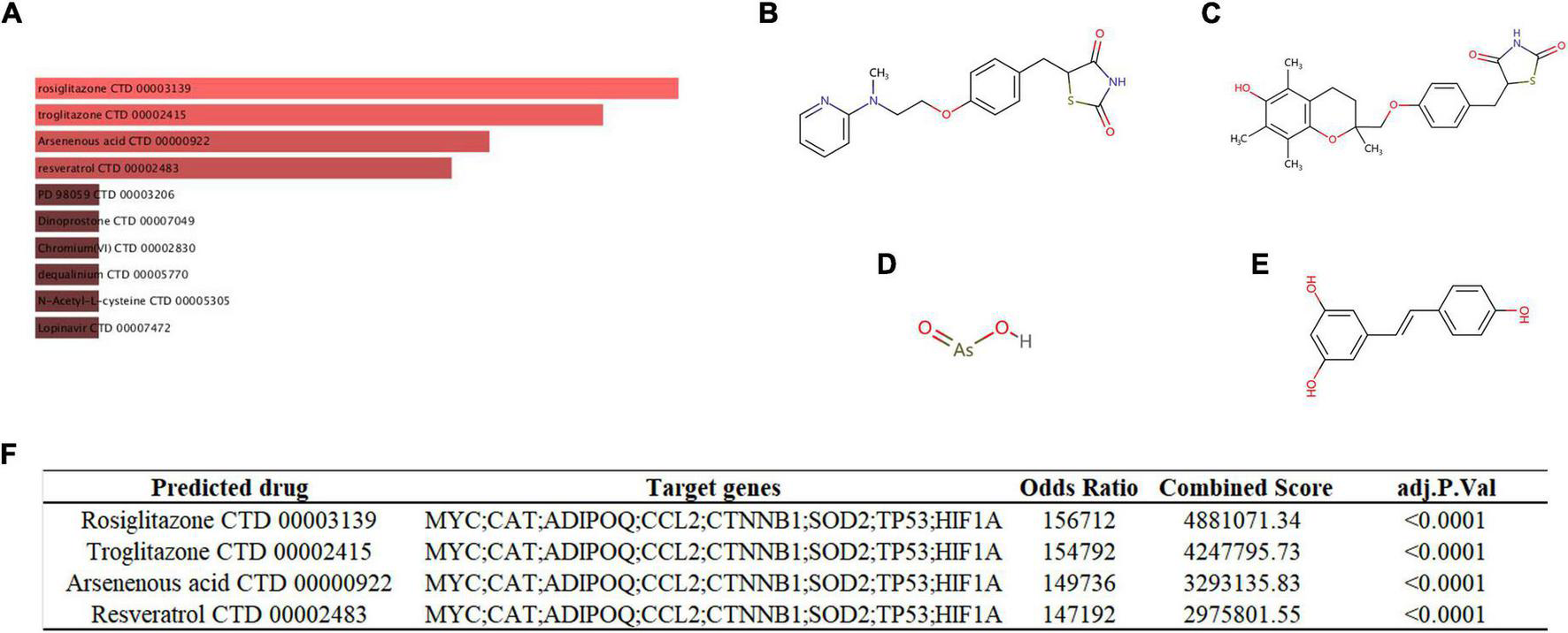 (A) Targeted drugs prediction. The top 10 predicted targeted drugs ranked according to combined score in the DSigDB database. The chemical structures of rosiglitazone (B), troglitazone (C), arsenous acid (D), and resveratrol (E). (F) Detailed prediction information of drugs with strong drug-target correlation.