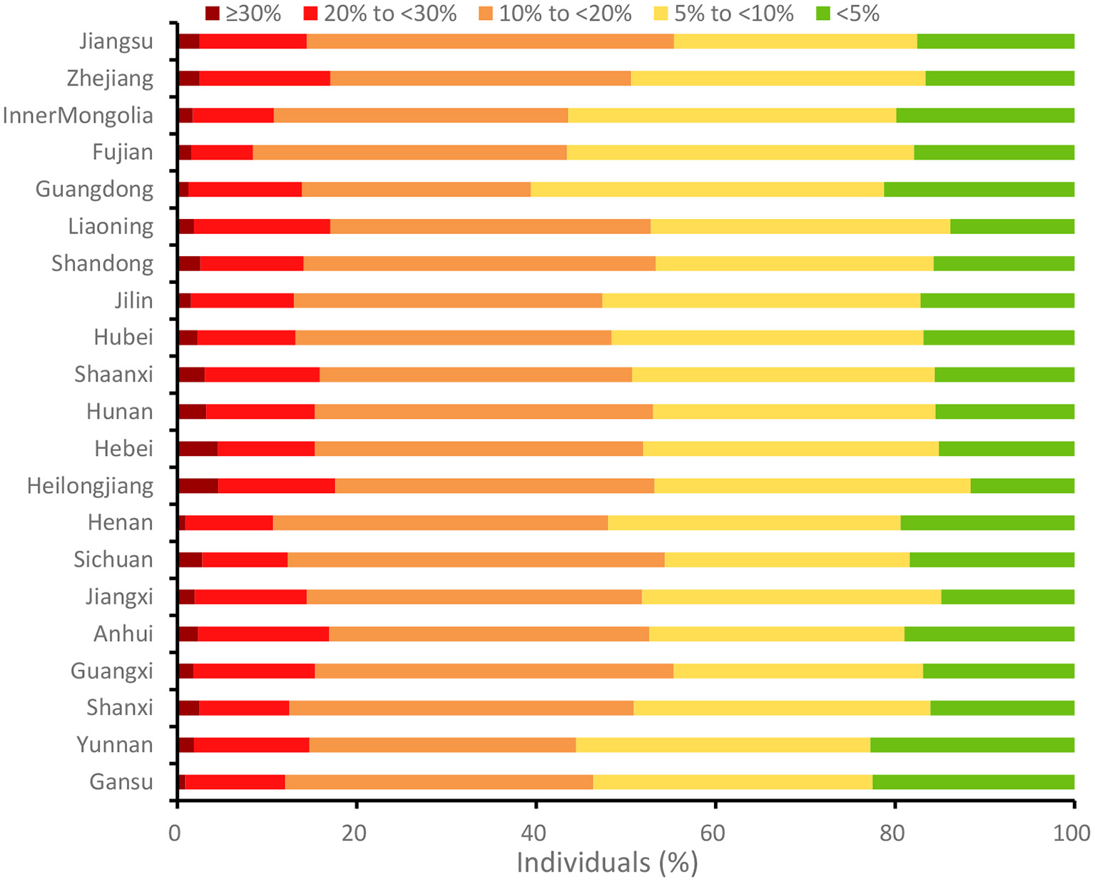 A total of 28 provinces were identified and rated in terms of economic development based on their 2015 Gross Domestic Product (GDP) per capita. To obtain robust estimates for each outcome at the subnational level, we removed seven provinces (Qinghai, Guizhou, Xinjiang, Chongqing, Tianjin, Beijing and Shanghai) with small sample size (e.g. fewer than 200 individuals) from provincial analysis.