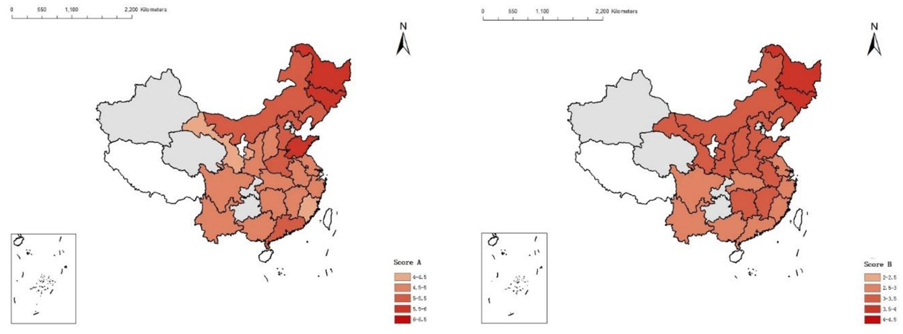 The average CRS and BRS for the full sample of provinces were 4.98 [95% confidence interval (CI) = 4.92, 5.05] and 3.10 (95% CI = 3.04, 3.15), respectively (Supplementary Table S3). The weighted mean CRS (BRS) varied significantly between Fujian and Jilin, ranging from 4.36 (3.71) to 5.72 (2.59). The regional structure of the provincial CVD and BRS is depicted in Figure 2. The CRS was significantly greater in the north-eastern region, comprising Heilongjiang and Jilin, and significantly lower in the south-east region, including Fujian and Zhejiang. Figure 2 reveals similar patterns for the BRS.