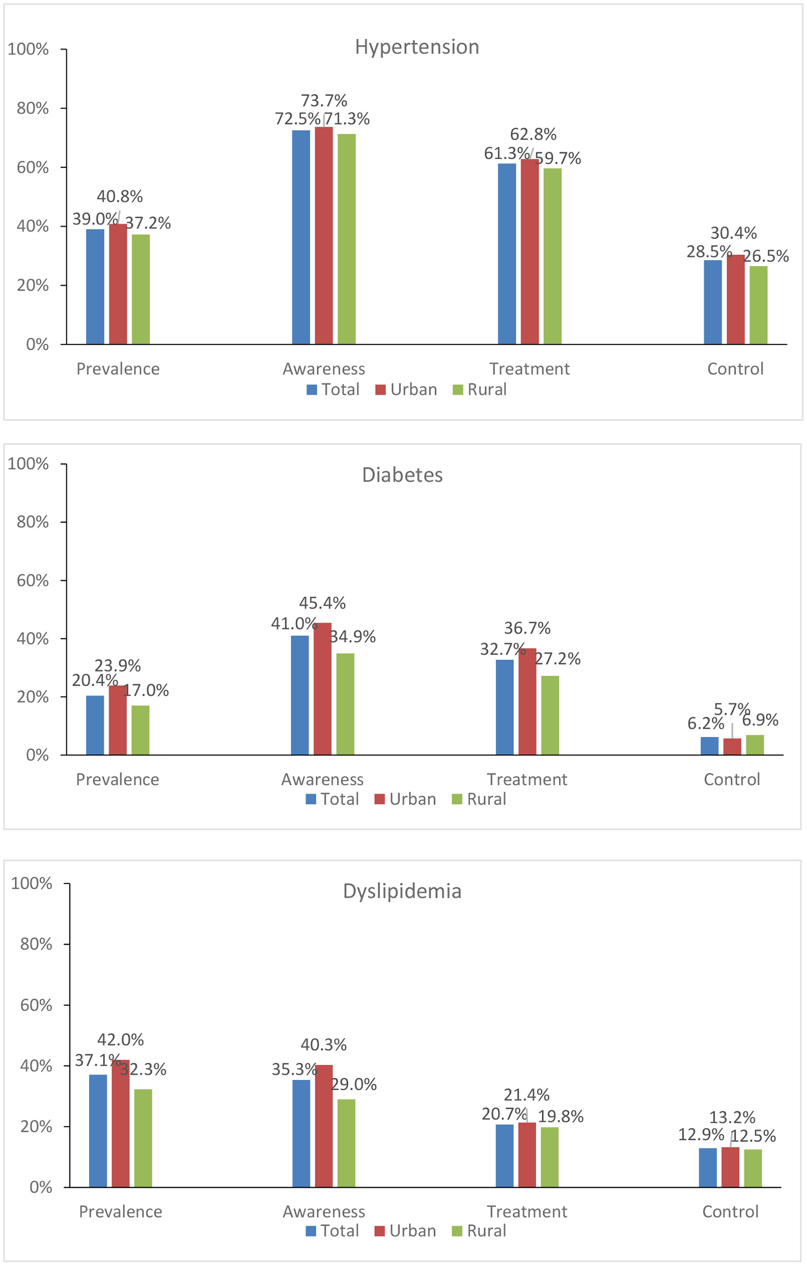In 2015, the weighted prevalence of hypertension, diabetes, and dyslipidaemia was 39.0, 20.4, and 37.1%, respectively, among Chinese individuals aged 45 years and older. Indicators of the care cascade for three CVDs examined are shown in Table 1 by sociodemographic category. In total, 72.5% of patients with hypertension were aware of their disease, 61.3% sought treatment, and 28.5% had their blood pressure under control. 41.0% of diabetics were aware of their illness, 32.7% sought treatment, and 6.2% had their diabetes under control. In terms of dyslipidaemia care, 35.3% of those with the condition were aware of it, 20.7% had sought therapy, and 12.9% were “managed.” Rural residents generally had lower results across all care cascade indicators (except for diabetes control) than urban residents (Figure 3).