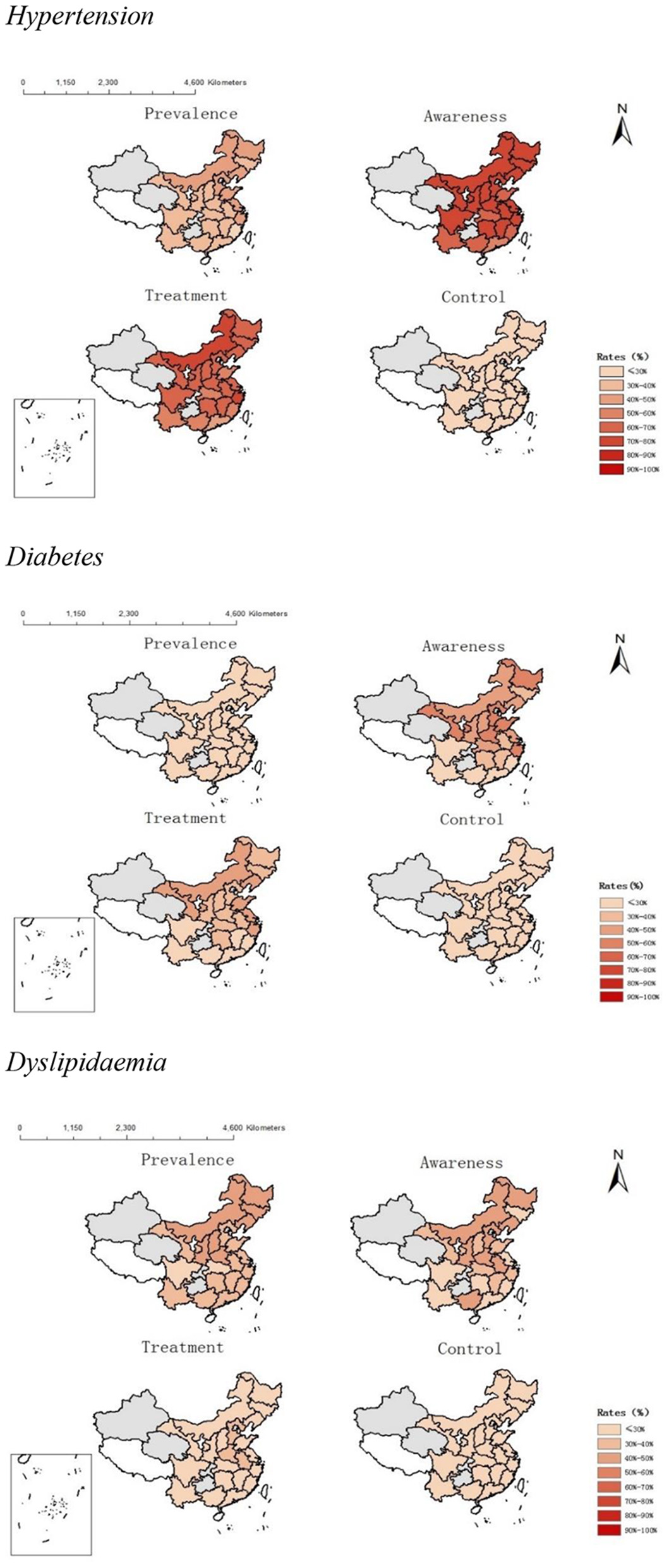 Furthermore, the relationship between provincial-level economic development, quality of care, and socioeconomic inequalities in quality of care is hardly known in China (18). This study employed data from a nationally representative survey to examine: (1) province-level variations in CVD risk scores and behavioral risk scores for CVDs in China; (2) province-level variations in the proportion of adults with hypertension, diabetes, and dyslipidaemia who have reached each step of the care cascade (awareness of diagnosis, sought treatment, and blood pressure/glycaemic/blood lipids, control); and (3) the association of province-level economic development and individual factors with the management of cascade of care for hypertension, diabetes, and dyslipidaemia.