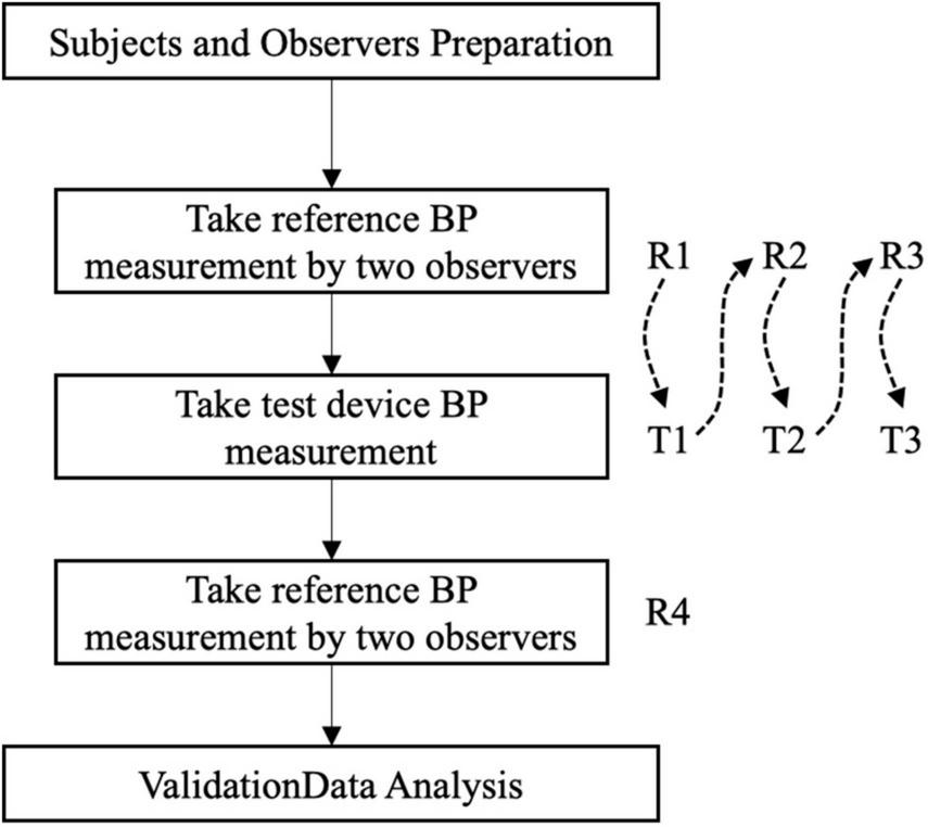 The same arm sequential BP measurement was applied in accordance with the ANSI/AAMI/ISO 81060-2:2018 guidelines. The measurements were taken in a quiet room, after a 5-min rest period. During the process, the participants remained quiet with their legs uncrossed in a sitting position. One validation included four reference BP measurements (R1-R4), alternating with three test-watch measurements (R1-T1-R2-T2-R3-T3-R4), as shown in Figure 2.