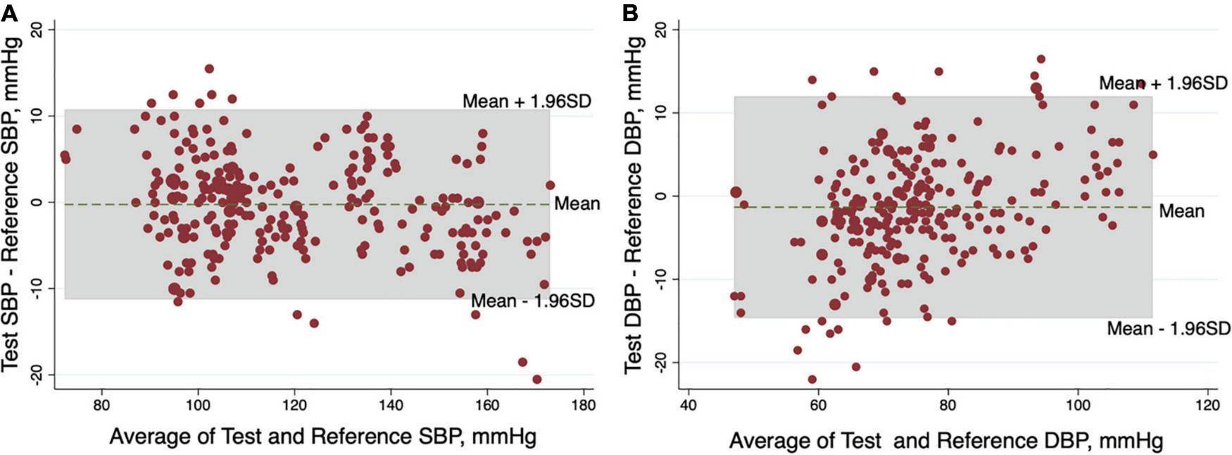 The mean age of the 85 participants was 48 ± 18 years (range: 21–85), and 53 (62.4%) were male. The mean differences between the test and reference BPs were -0.25 ± 5.62 mm Hg and -1.33 ± 6.81 mm Hg for SBP and DBP, respectively (according to Criterion 1). The mean differences between the test BPs and reference BPs were -0.25 ± 5.00 mm Hg and -1.33 ± 6.31 mm Hg for SBP and DBP, respectively, according to Criterion 2.