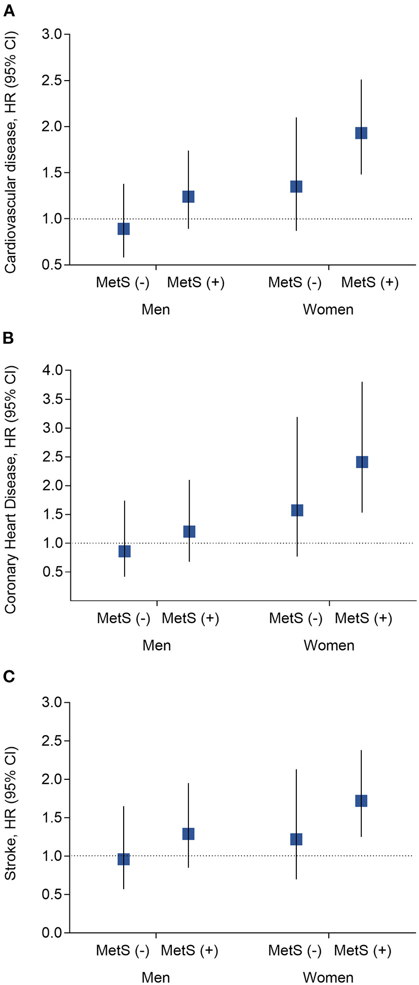 Analysis of the hazard risk of kidney stones with risk of incident cardiovascular events by MetS x sex interaction subgroups. (A) Risk of cardiovascular diseases; (B) Risk of coronary heart disease; (C) Risk of stroke. Data are present as hazard ratio (HR) and 95% confidence interval (CI). P-values were calculated from the multivariable Cox regression models. Adjustments included for age (year), baseline level of body mass index (kg/m2), waist circumference (cm), quartiles of physical activity, quartiles of sedentary time, smoking status (current, former, and never), alcohol drinking (g/l), education level (percentage of high school and above), systolic and diastolic blood pressure (mmHg), fasting plasma glucose (mmol/l), oral glucose tolerance test 2-h glucose (mmol/l), HOMA-IR, low- and high-density lipoprotein cholesterol (mmol/l), and triglycerides (mmol/l), gall stone (yes or no), diet score and eGFR. MetS, metabolic syndrome.