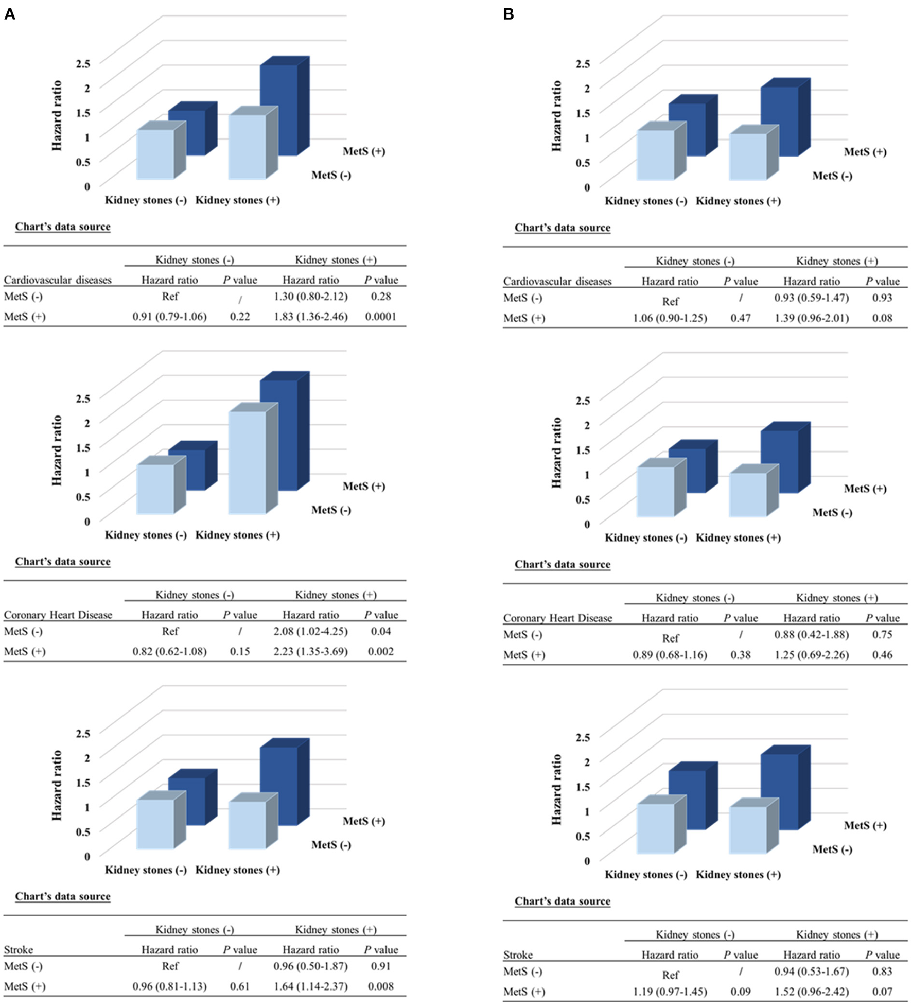 Combined effect of kidney stones and MetS presence on risk of incident cardiovascular events by sex. (A) Women; (B) Men. P-values were calculated from the multivariable Cox regression models, after adjustments for the same covariates as Figure 1. MetS, metabolic syndrome.