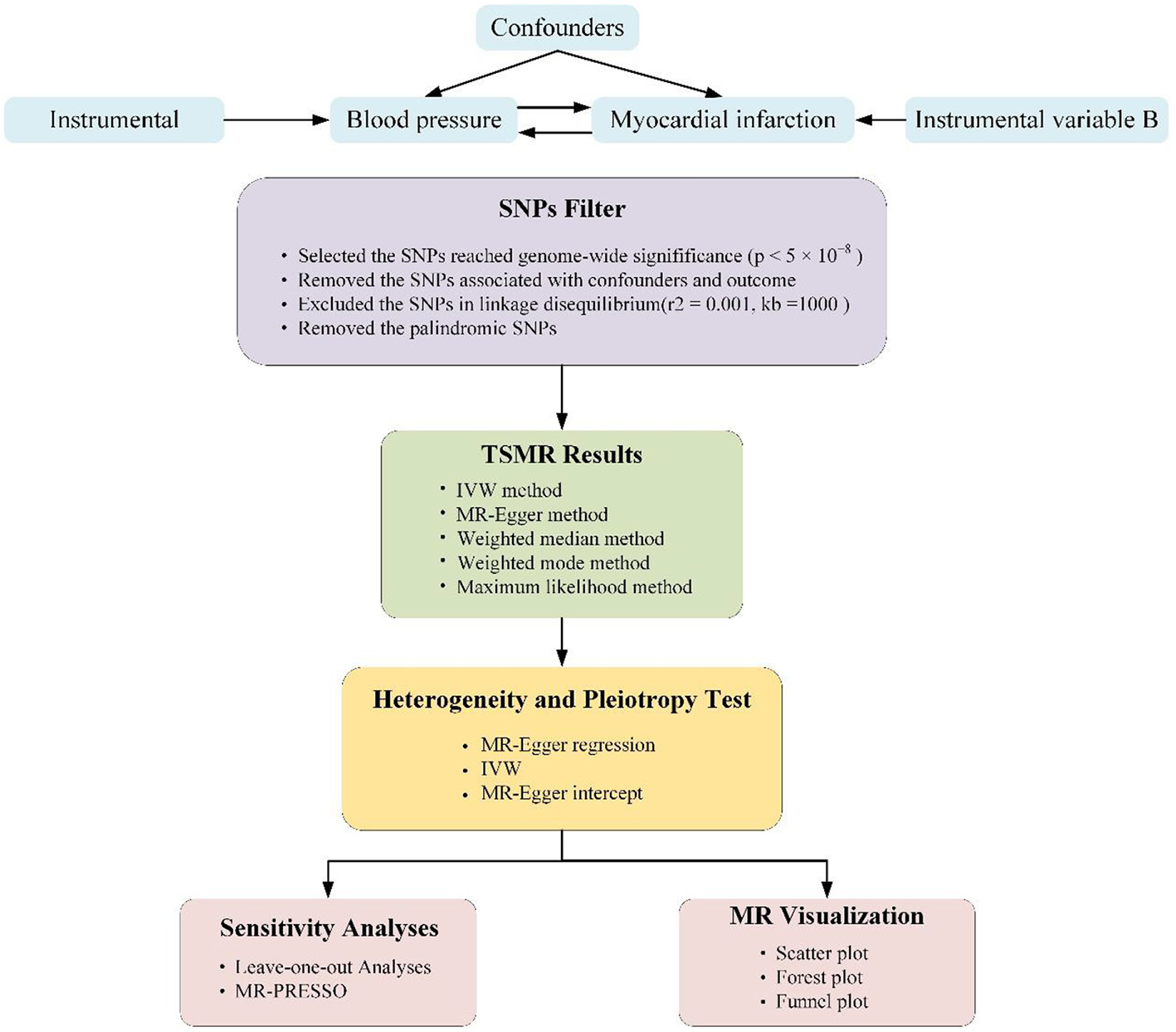 It is difficult to confirming a causality, as the effect between BP and MI might be confounded with several disparate factors. For instance, elevated BP is usually associated with advanced age, which is also an vital risk factor. This makes it challenging to clarify whether or not BP and MI are related to each other or simply mean comorbidities clustered in older subjects. Mendelian randomization (MR) (10) is an instrument that uses genetic variants as instrumental variables (IVs) of the exposure to estimate the causal effects of the exposure on outcome and can overcome the confounding existing in the observational studies (11). Due to the allocation of genes randomly from parents to their offspring at conception, IVs are less susceptible to confounding or reverse the causality (12, 13). Two-sample MR (TSMR) analyze is an extension of the MR approach that allows the application of summary statistics of genome-wide association studies (GWASs) for MR studies without direct analysis of individual data. The causation risk reversely is minimized too, on the grounds that the history of a disease could not have an effect on an individual's genotype (10). In our study, we carried out bidirectional MR analyses by performing summary-level data from the available GWASs on BP and MI to investigate the role of BP levels in MI causally.