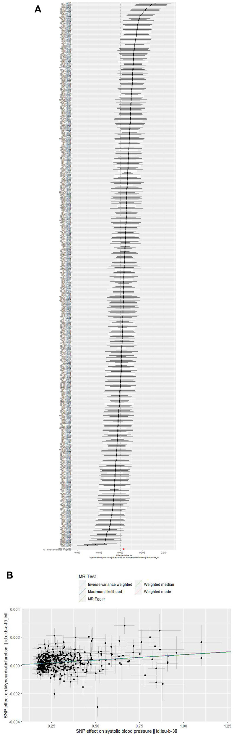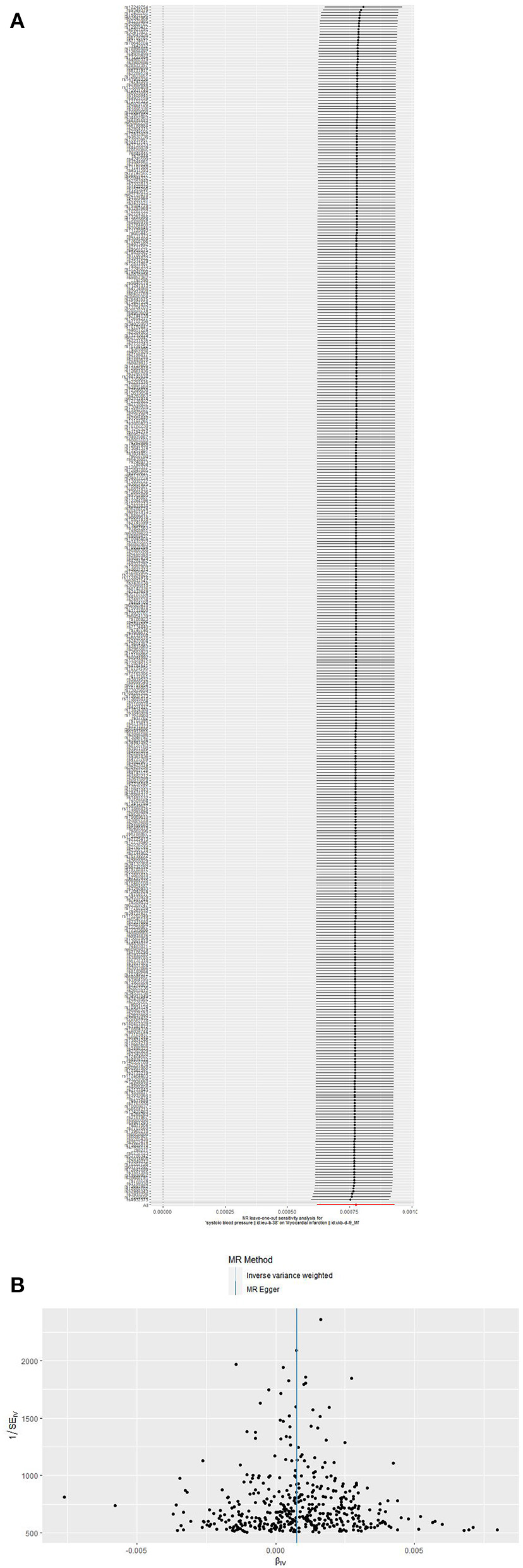 After the exclusion of SNPs in LD (r2 = 0.001, 10,000 kb), 461 SNPs for SBP,460 SNPs for DBP and 16 SNPs for PP were identified as instruments in the GWAS. After assessment for the three key assumptions of TSMR was conducted and the palindromic SNPs were removed, 434 SNPs for SBP,442 SNPs for DBP and 15 SNPs for PP were included in the analysis. Alcohol consumption, diabetes, smoking, and cholesterol and triglyceride levels were used as confounders. The details of our forward MR analysis are shown in Table 1. A dramatical positive causal result was displayed by IVW and other methods (OR: 1.0008, 95% CI: 1.0006–1.0009, P = 1.911e−22 for SBP, OR: 1.0014, 95% CI: 1.0011–1.0016, P = 1.788e-28 for DBP and OR: 1.0092, 95% CI: 0.9958–1.0227, P = 0.179 for PP). Random effect methods were performed to account for the material heterogeneity exposed in IVW (PSBP = 7.102e-23, PDBP = 9.912e-15,Ppp = 8.795e-7) and MR–Egger (PSBP = 5.304e-23, PDBP = 1.716e-14,Ppp = 1.850e-6). Notably, the intercept obtained with the MR–Egger approach was un-noteworthy, hinting that the SNPs correspond to BP did not perform any pleiotropic effects (PSBP = 0.869, PDBP = 0.109, Ppp = 0.978). The overall estimates revealed causal associations between BP and MI (Figure 3, Supplementary Figures 1B, 2, 8). Sensitivity analyses conducting the leave-one-out association approach also verified the results (Figure 2A, Supplementary Figures 1A, 7A). Moreover, funnel plot were asymmetry (Figure 2B, Supplementary Figure 7B).