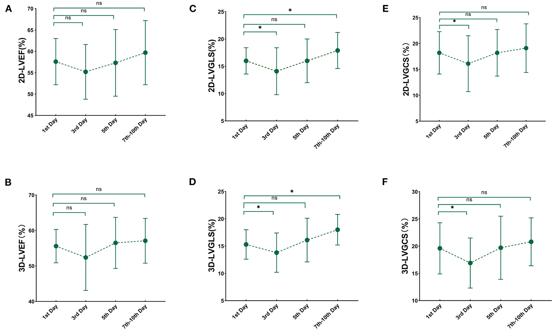 In patients with sepsis or septic shock, 3D and 2D LVEF were not different at each time point. GLS and GCS obtained by 3D STE and 2D STE decreased on the first day compared with the healthy group (all P < 0.01). Compared with the values on the first day, GLS and GCS further decreased on the third day, while 3D and 2D LVEF did not differ. 3D and 2D STE strains were lowest on the third day and gradually improved on the seventh to the tenth day compared with values on the third day. When compared with values on the first day, 3D and 2D GLS gradually improved on the seventh to the tenth day, whereas 3D and 2D GCS on the seventh to the tenth day was not different. Although 3D and 2D STE strains were significantly increased on the seventh to the tenth day, they were not fully recovered to normality.