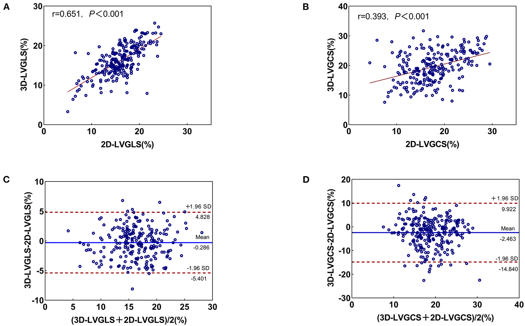 Continuous variables were expressed as mean ± SD for normally distributed data or median [interquartile range (IQR)] for abnormally distributed variables. Categorical variables were expressed as numbers (percentages). For comparison between groups, the Kruskal Wallis H and repeated-measures analysis of variance (ANOVA) were used for continuous variables. Correlations between continuous variables were evaluated with Pearson's correlation coefficients. Bias and limits of agreement (LOA) between two different measurements were evaluated using the Bland–Altman analysis. To compare with the healthy group, an independent sample t-test was used. The interobserver and intraobserver variability of the 3D and 2D STE parameters were assessed by the intraclass correlation coefficients (ICCs) and the Bland–Altman analyses. The data were analyzed with IBM SPSS Statistics for Windows (Version 26.0, IBM Corp Armonk, NY, USA). A two-sided p-value < 0.05 was considered significant.