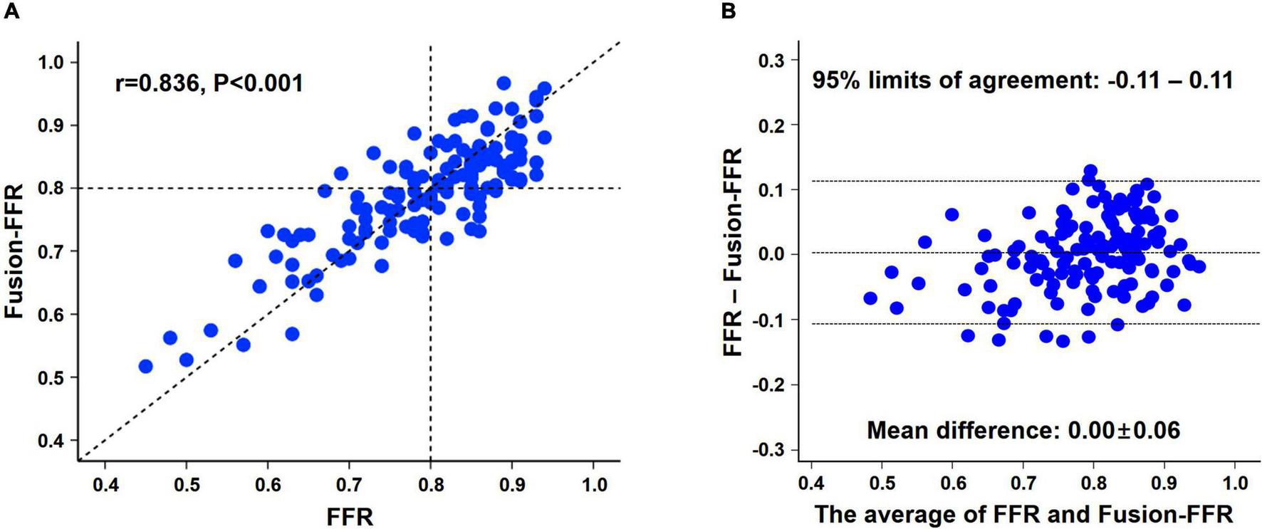 Relationship between pressure wire-based FFR and Fusion-FFR. Correlation (A) and agreement (B) between pressure wire-based FFR and Fusion-FFR. FFR, fractional flow reserve; Fusion-FFR, computational FFR from coronary CTA-OCT fusion images.